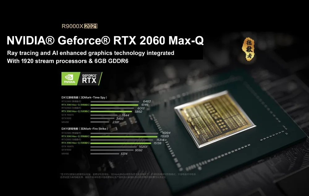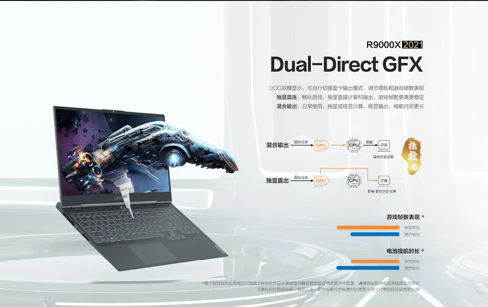 In terms of graphics, the Legion R9000X 2021 is equipped with NVIDIA’s RTX 2060 Max-Q graphics card, claiming that 60% of the power consumption to achieve 90% of the performance, but also supportsDual-Direct GFX dual-mode display, which can be switched between solo and integrated graphics.