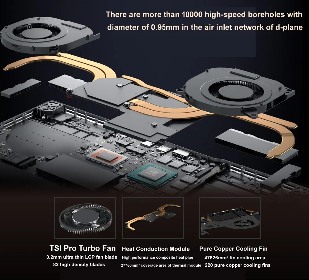 The Legion R9000X 2021 is equipped with the TSI Frost Blade Pro cooling system, which uses advanced technologies such as pure copper cooling fins, high-performance heat pipes, and supercharged fans 2.0 to support full-zone air intake.