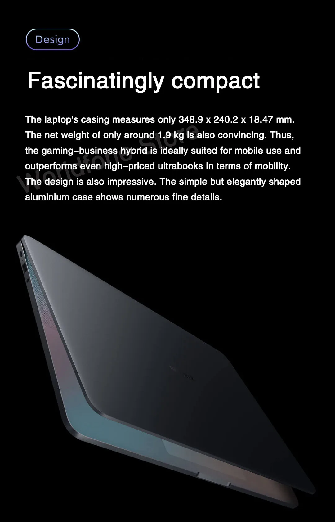 In view of the rich equipment and the powerful hardware, Xiaomi surprises with a very compact design of the Notebook Pro X. The laptop's casing measures only 348.9 x 240.2 x 18.47 mm. The net weight of only around 1.9 kg is also convincing. Thus, the gaming-business hybrid is ideally suited for mobile use and outperforms even high-priced ultrabooks in terms of mobility. The design is also impressive. The simple but elegantly shaped aluminium case shows numerous fine details.