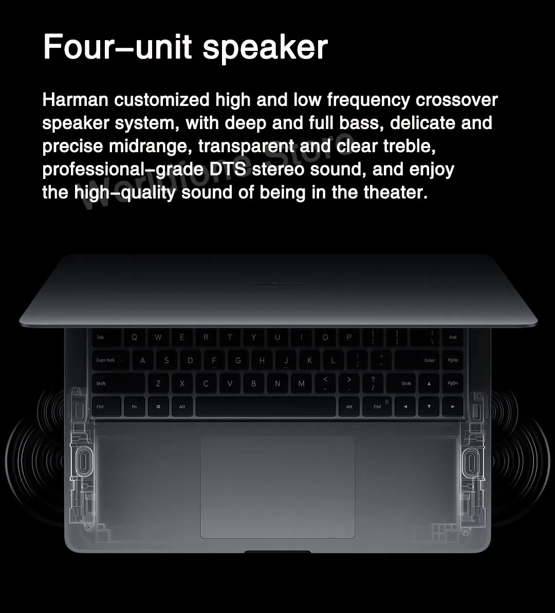 Speaker: Harman customized high and low frequency crossover speaker system, the sound is certified by Audio by Harman, 2W x 2+1W x 2