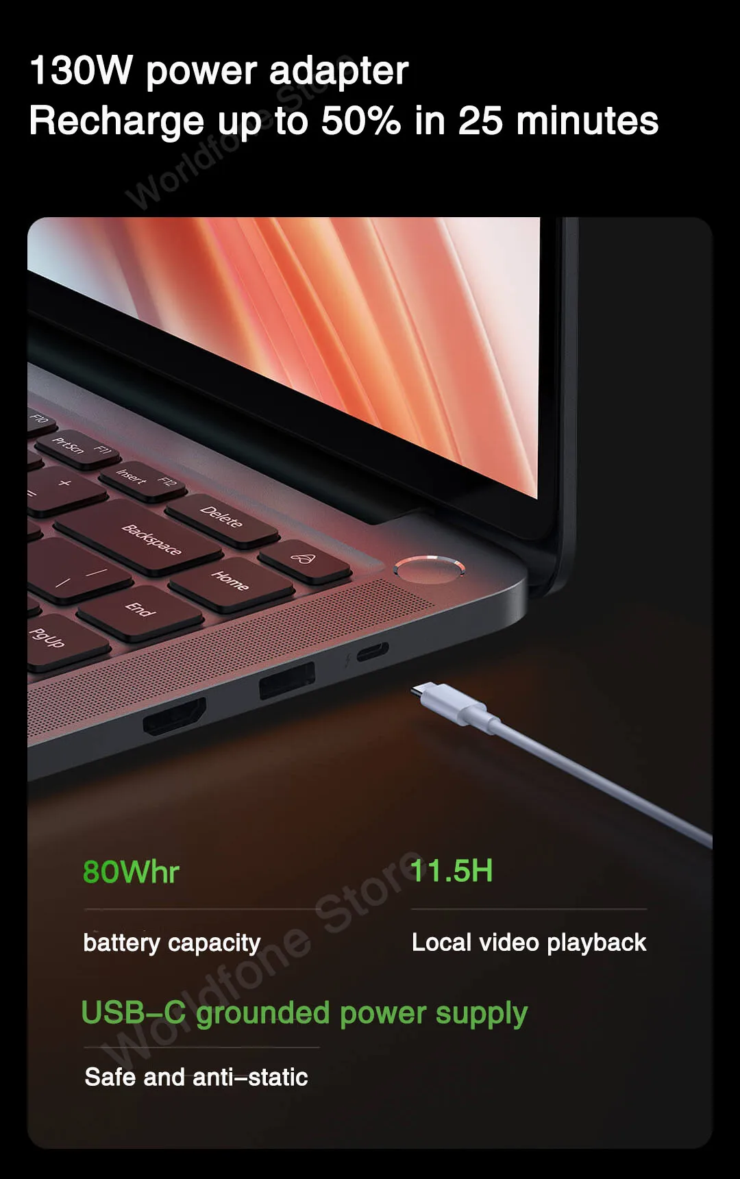 80 watt-hour (rated) battery capacity, 130W USB-C power adapter, 11.5 hours of local video playback*, 50% charge in 25 minutes*
