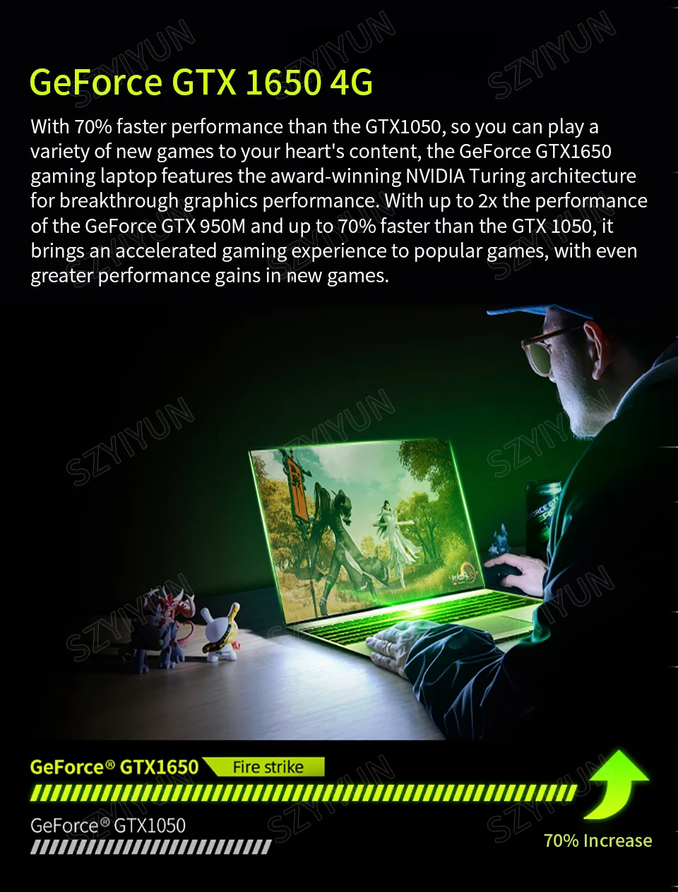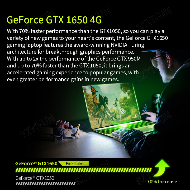 With 70% faster performance than the GTX1050, so you can play a variety of new games to your heart's content, the GeForce GTX1650 gaming laptop features the award-winning NVIDIA Turing architecture for breakthrough graphics performance. With up to 2x the performance of the GeForce GTX 950M and up to 70% faster than the GTX 1050, it brings an accelerated gaming experience to popular games, with even greater performance gains in new games.