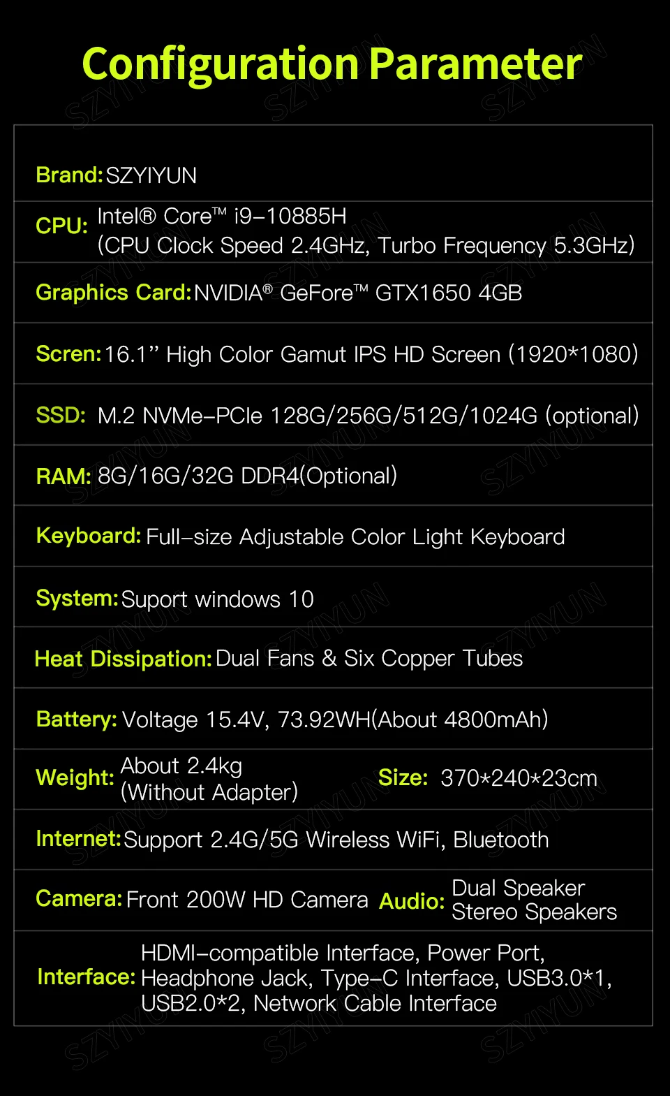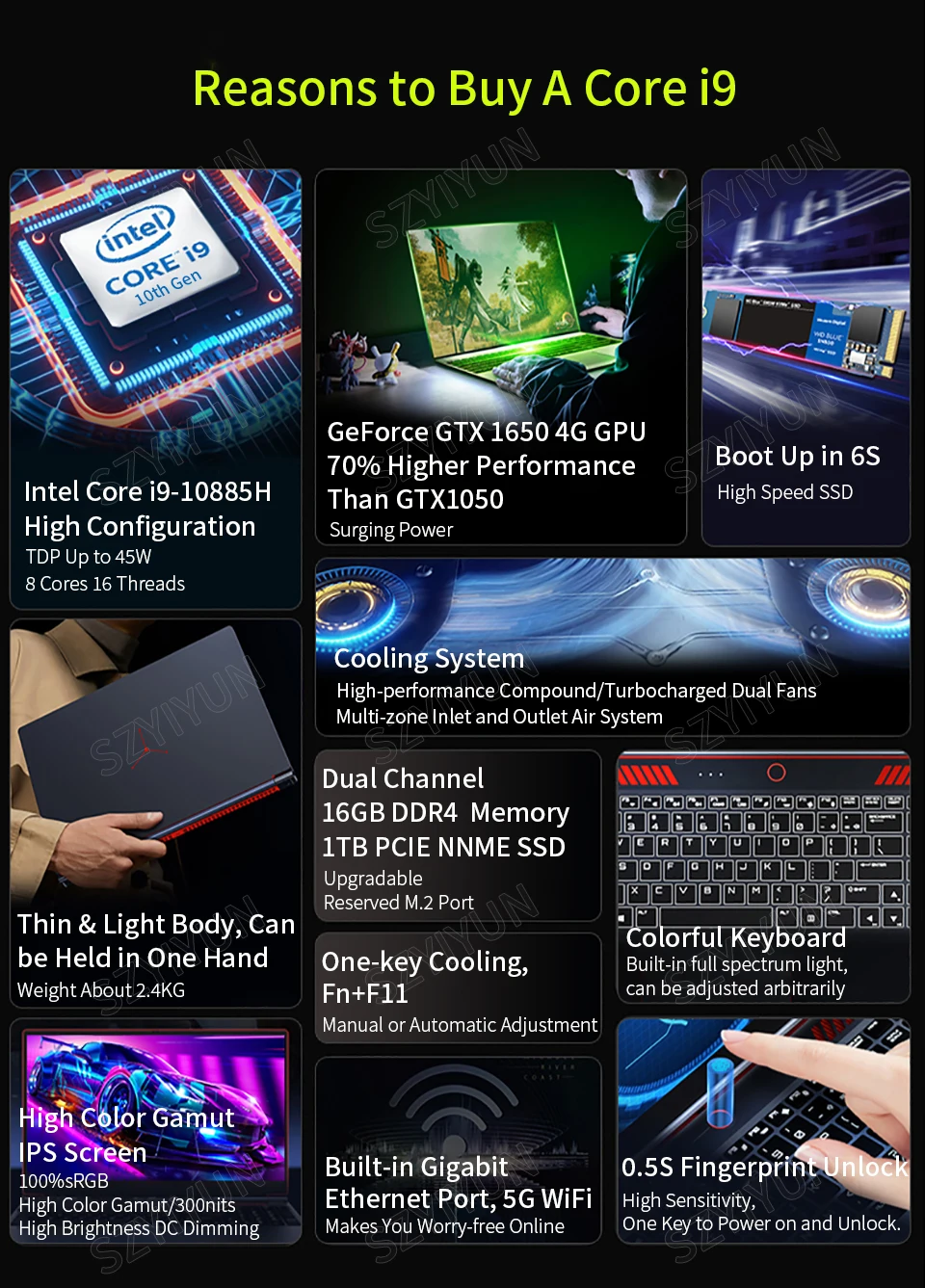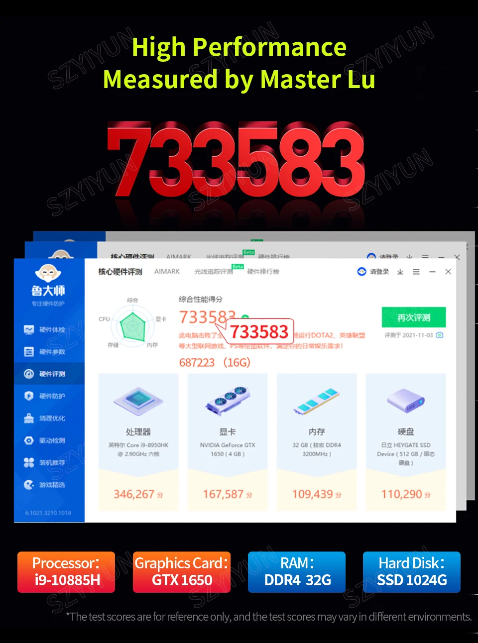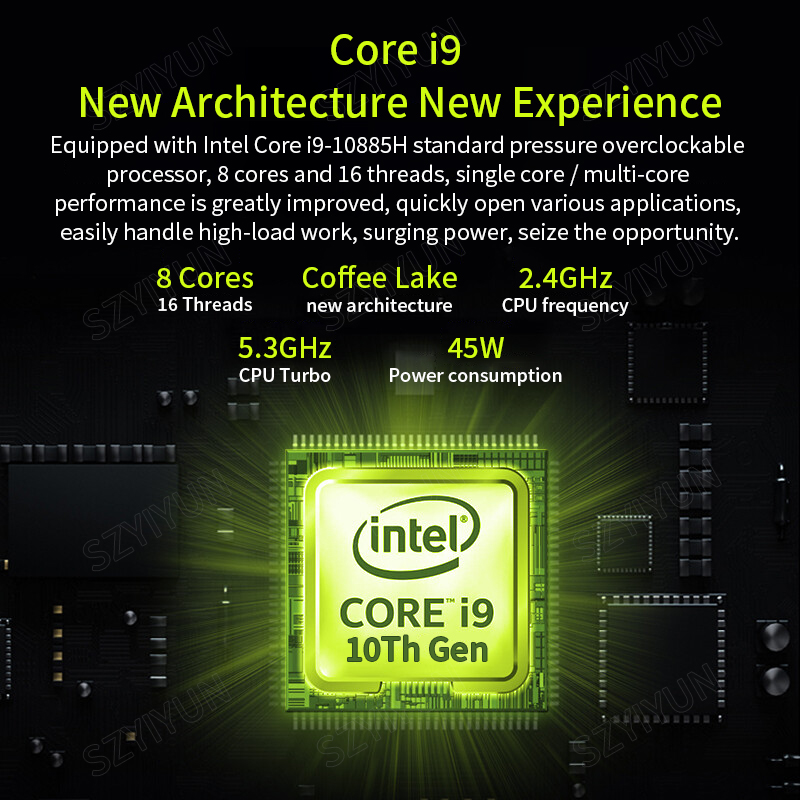 Equipped with Intel Core i9-10885H standard pressure overclockable processor, 8 cores and 16 threads, single core / multi-core performance is greatly improved, quickly open various applications, easily handle high-load work, surging power, seize the opportunity.