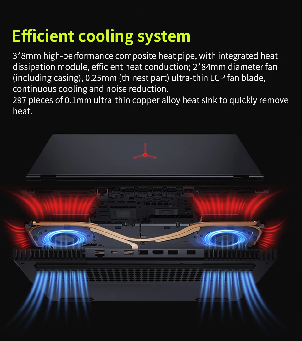 3*8mm high-performance composite heat pipe, with integrated heat dissipation module, efficient heat conduction; 2*84mm diameter fan (including casing), 0.25mm (thinest part) ultra-thin LCP fan blade, continuous cooling and noise reduction. 297 pieces of 0.1mm ultra-thin copper alloy heat sink to quickly remove heat.