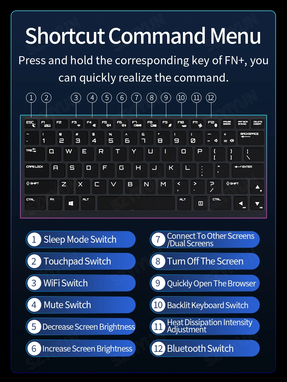Press and hold the corresponding key of FN+, you can quickly realize the command.