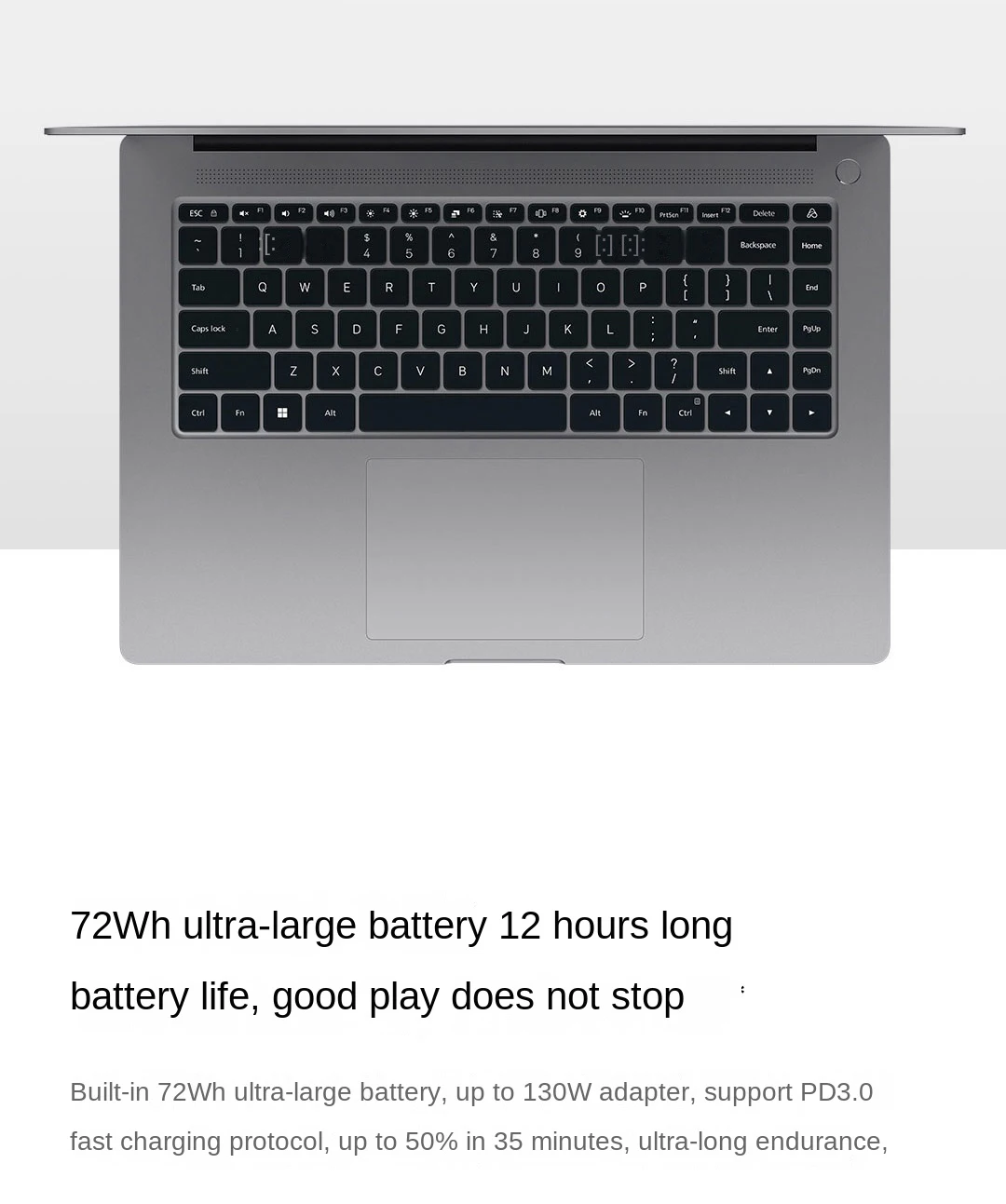 72Wh (nominal) battery capacity, 130W (single display version) USB-C ADP power adapter / 100W (integrated display version) GaN USB-C ADP power adapter