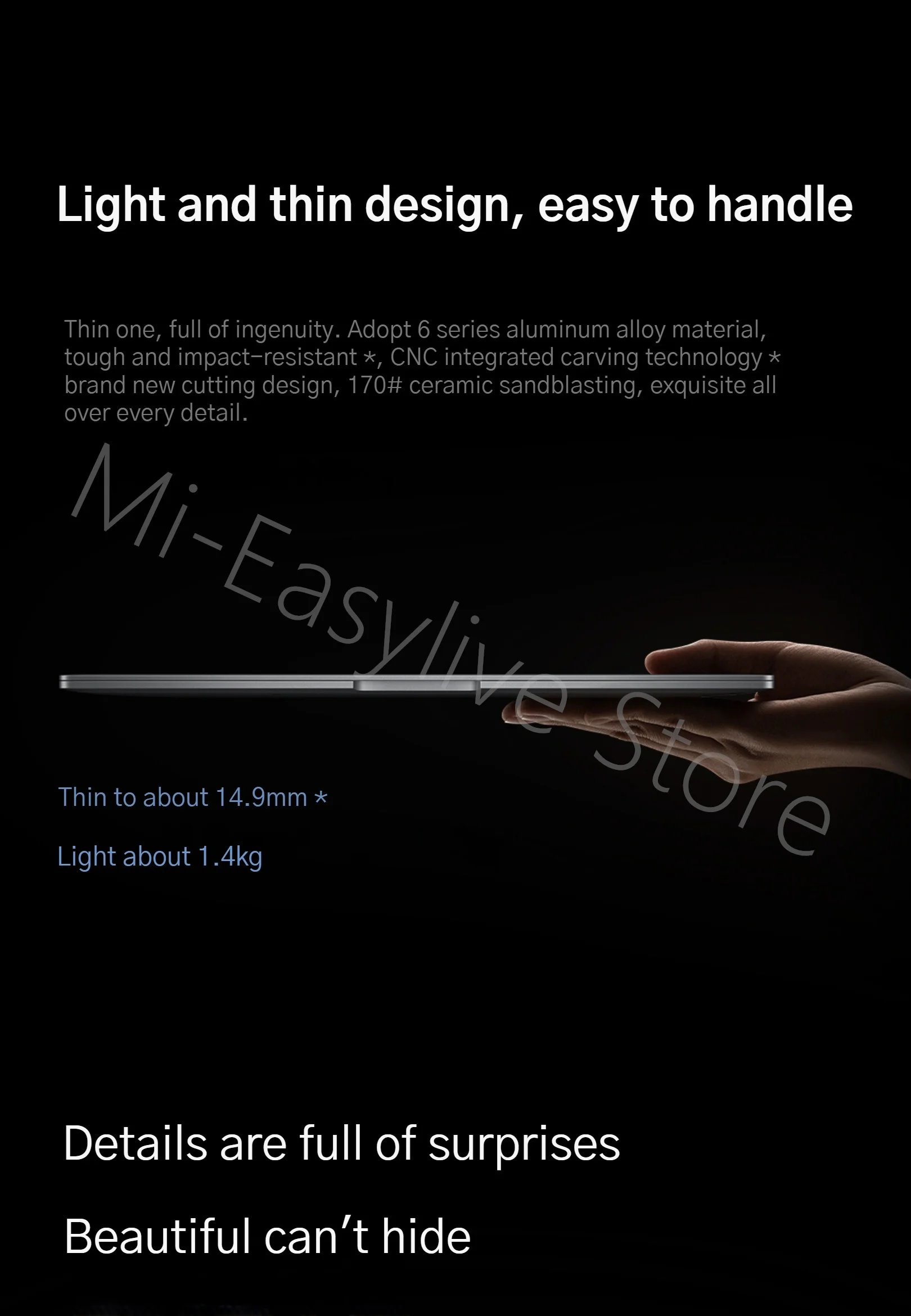 * As thin as about 14.9mm, the data comes from the Xiaomi laboratory, and the measurement method is the thickness data from the back side of the bottom front foot pad to the surface A