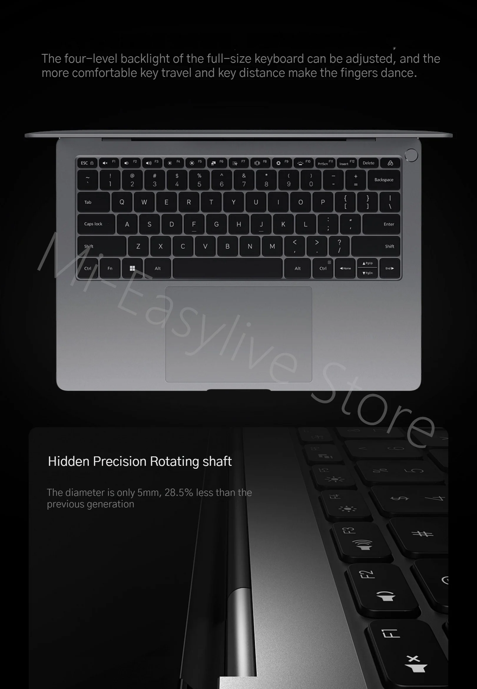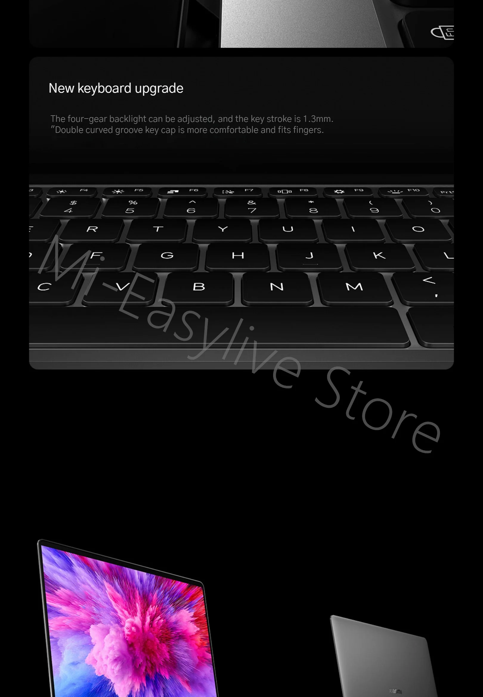 Full-size four-level backlit keyboard with 1.3mm key travel