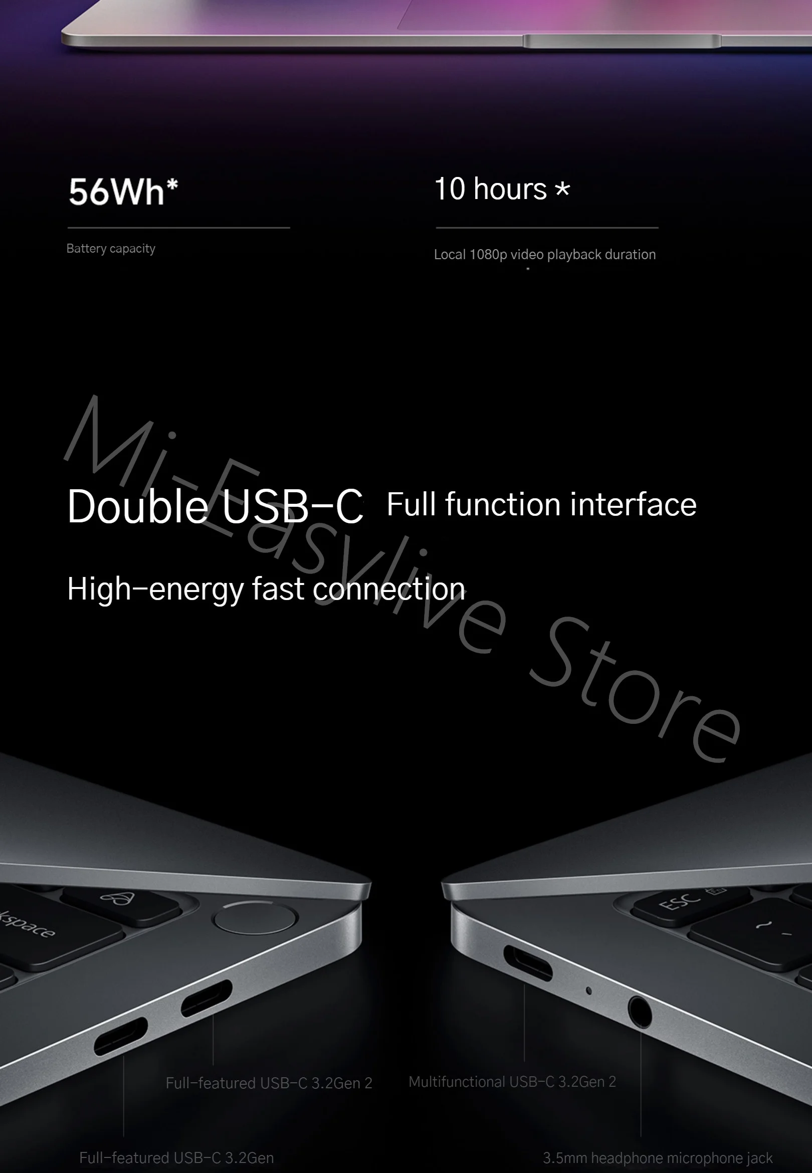 56Wh (nominal) battery capacity, 100W GaN power adapter,