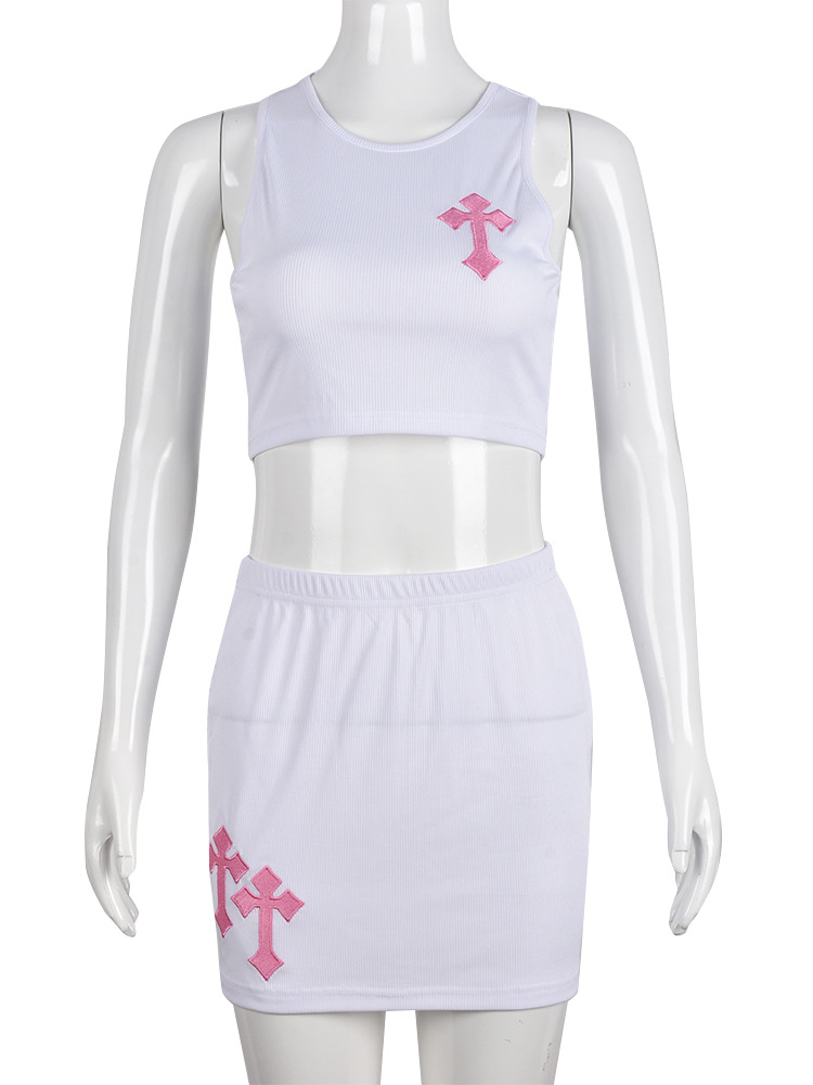Sifreyr Women Skirt Set Cross Embroidered Ribbed Two Piece Sets Sexy Sleeveless Crop Top And Mini Skirt Suits Party Dress Sets