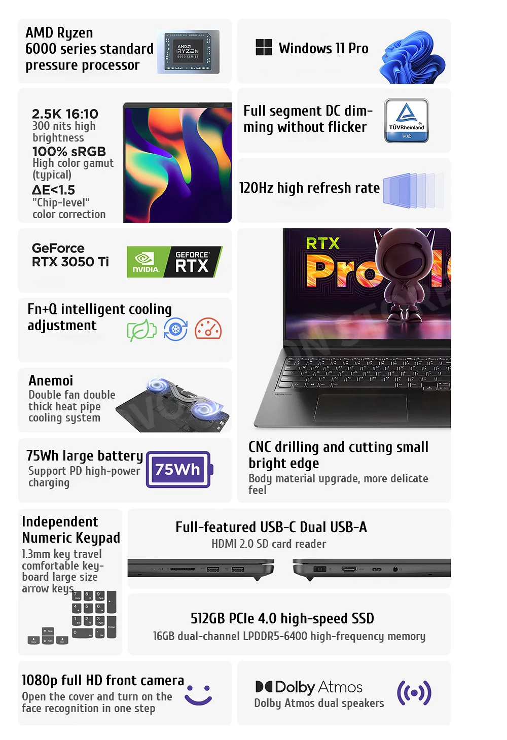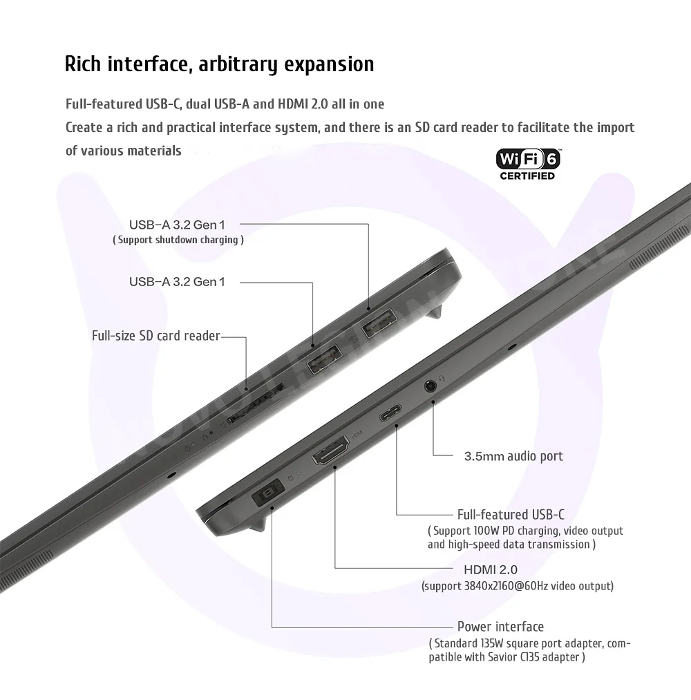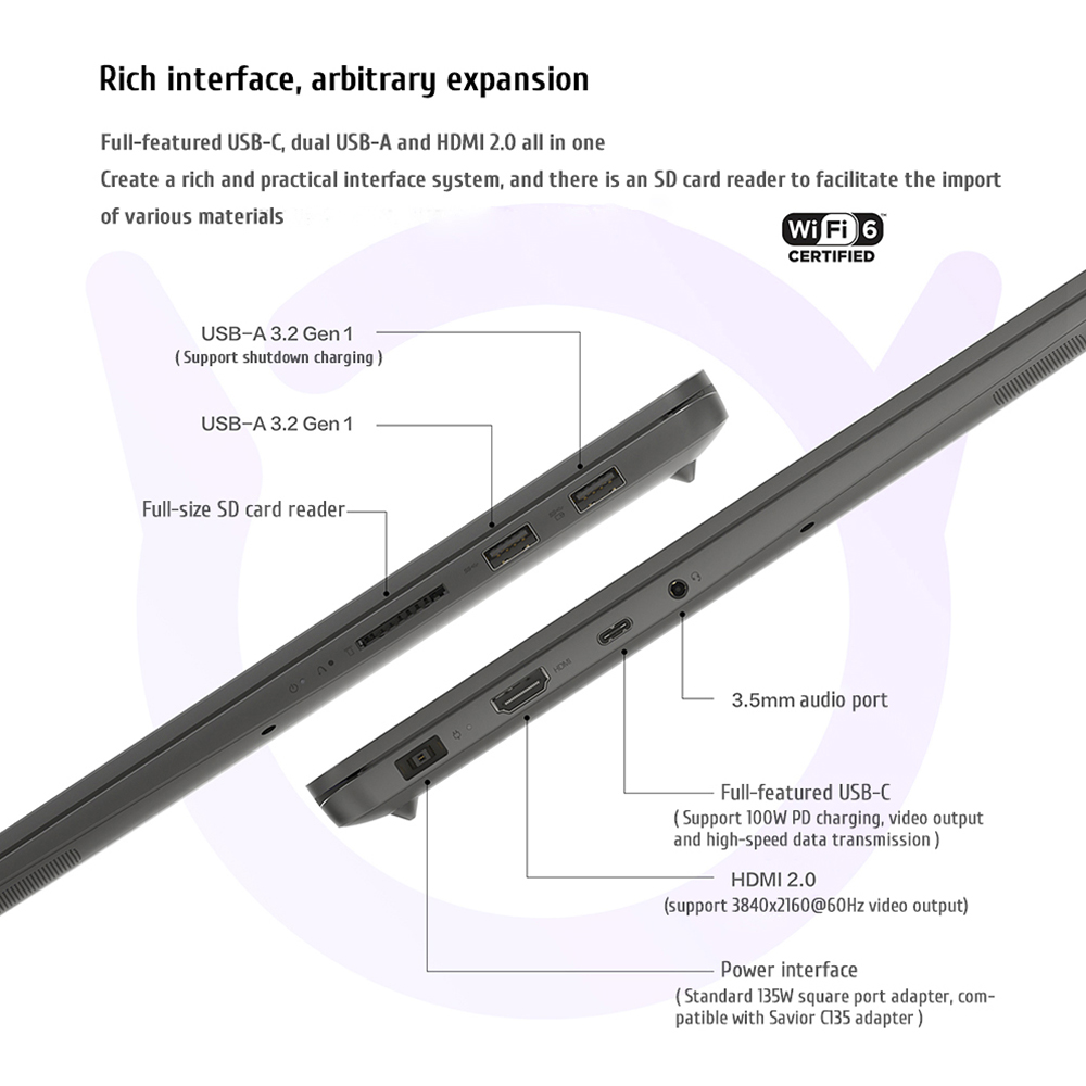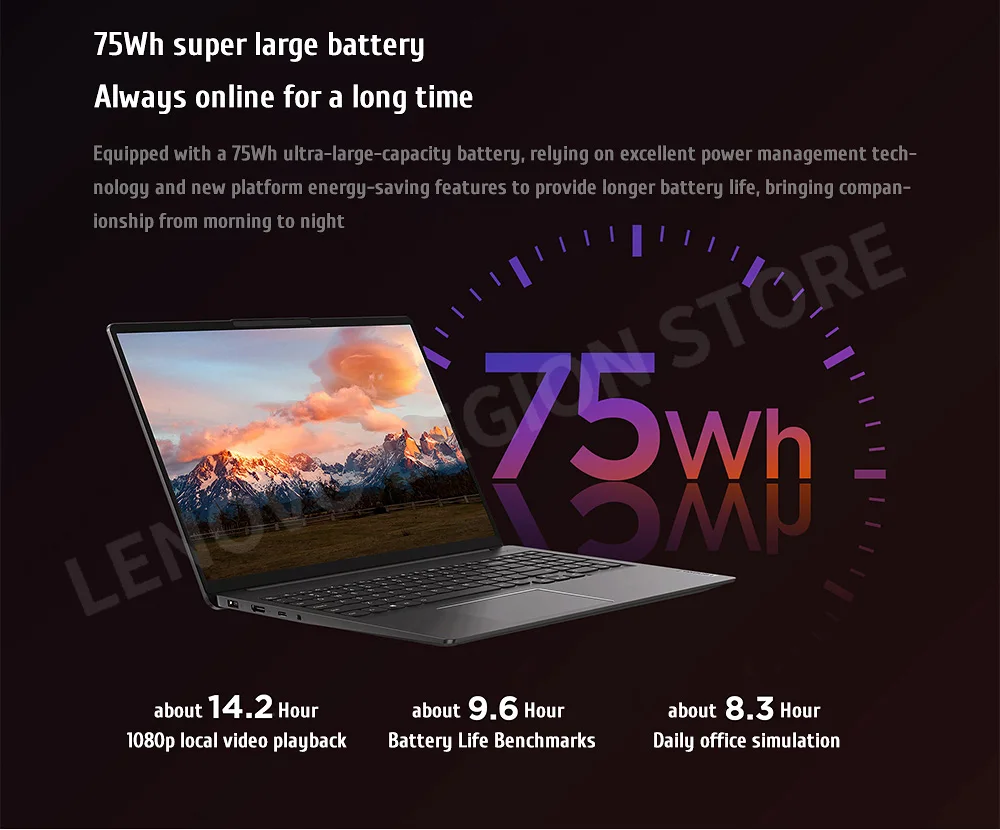 Equipped with a 75Wh ultra-large-capacity battery, relying on excellent power management tech-nology and new platform energy-saving features to provide longer battery life, bringing compan-ionship from morning to night