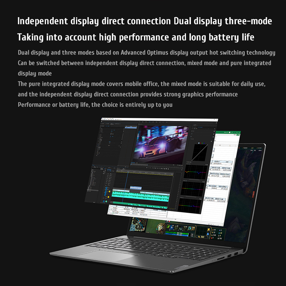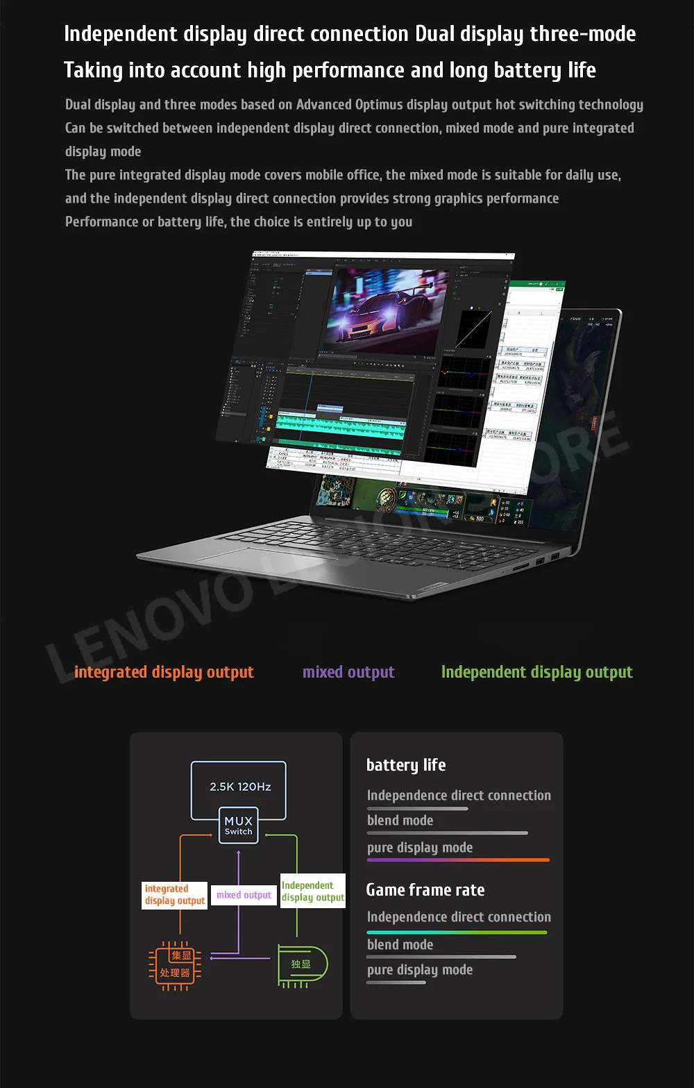 Dual displag and three modes based on Audvanced Optimus dlsplay output hot switching technologu Can be switched between independent display direct connection, mbxed mode and pure integrateddisplay mode
