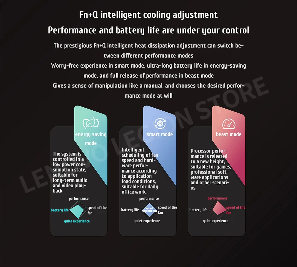 The prestigious Fn+Q intelligent heat dissipation adjustment can switch be-tween different performance modes