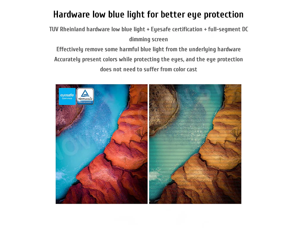 Hardware low blue light for better eye protectionTUV Rheinland hardware low blue light + Eyesafe certification + full-segment DC dimming screen
