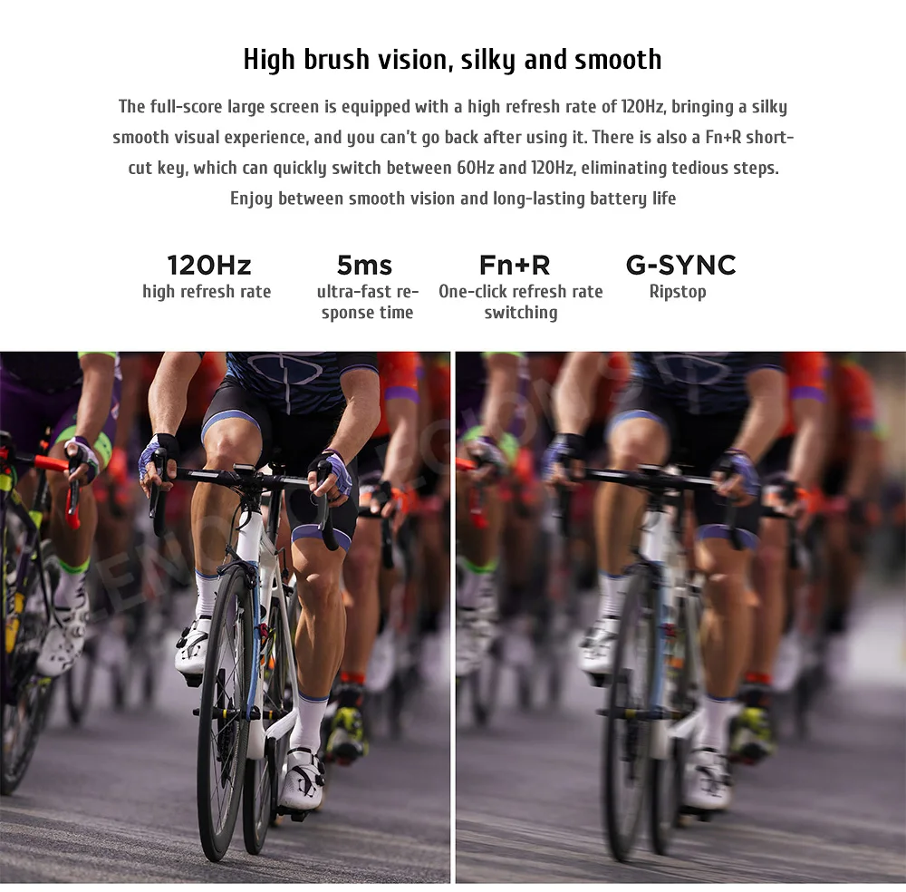 High brush vision, silky and smoothThe full-score large screen is equipped with a high refresh rate of 120Hz, bringing a silky smooth visual experience, and you can't go back after using it.There is also a Fn+R short-cut key, which can quickly switch between 60Hz and 120Hz,eliminating tedious steps.