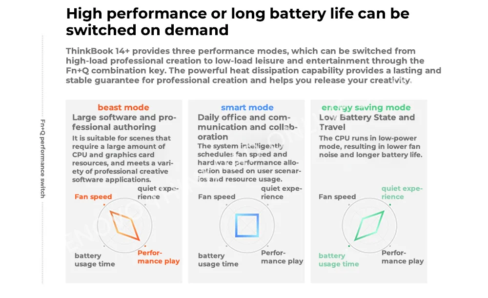 ThinkBook 14+ provides three performance modes, which can be switched fromhigh-load professional creation to low-load leisure and entertainment through theFn+Q combination key.The powerful heat dissipation capability provides a lasting andstable guarantee for professional creation and helps you release your creativity.