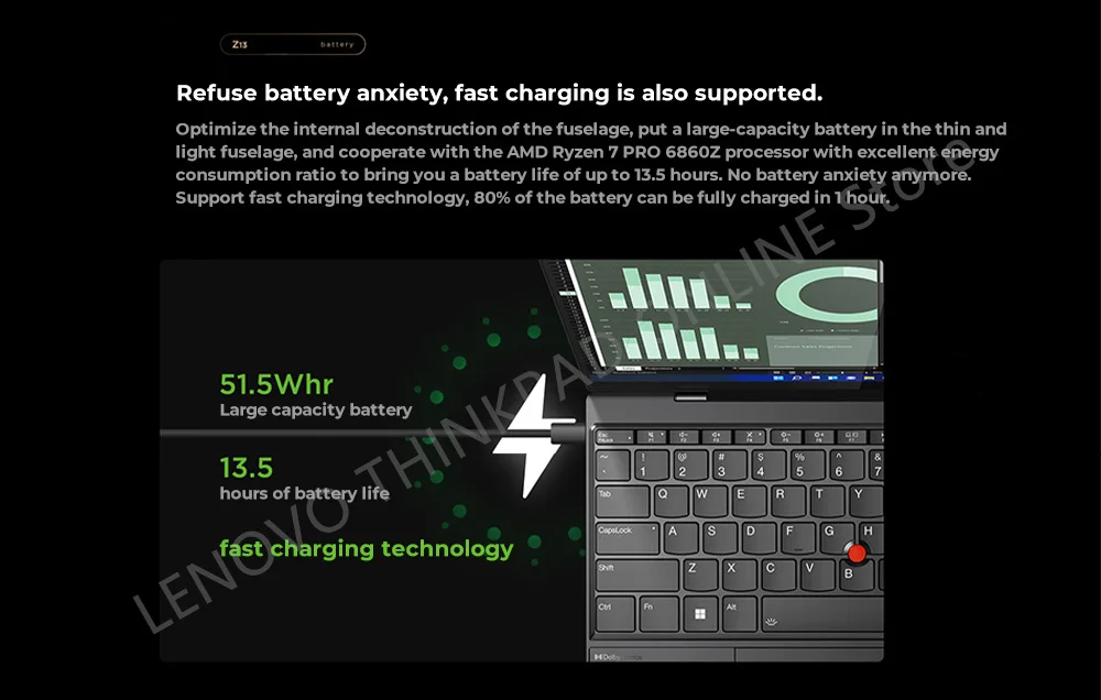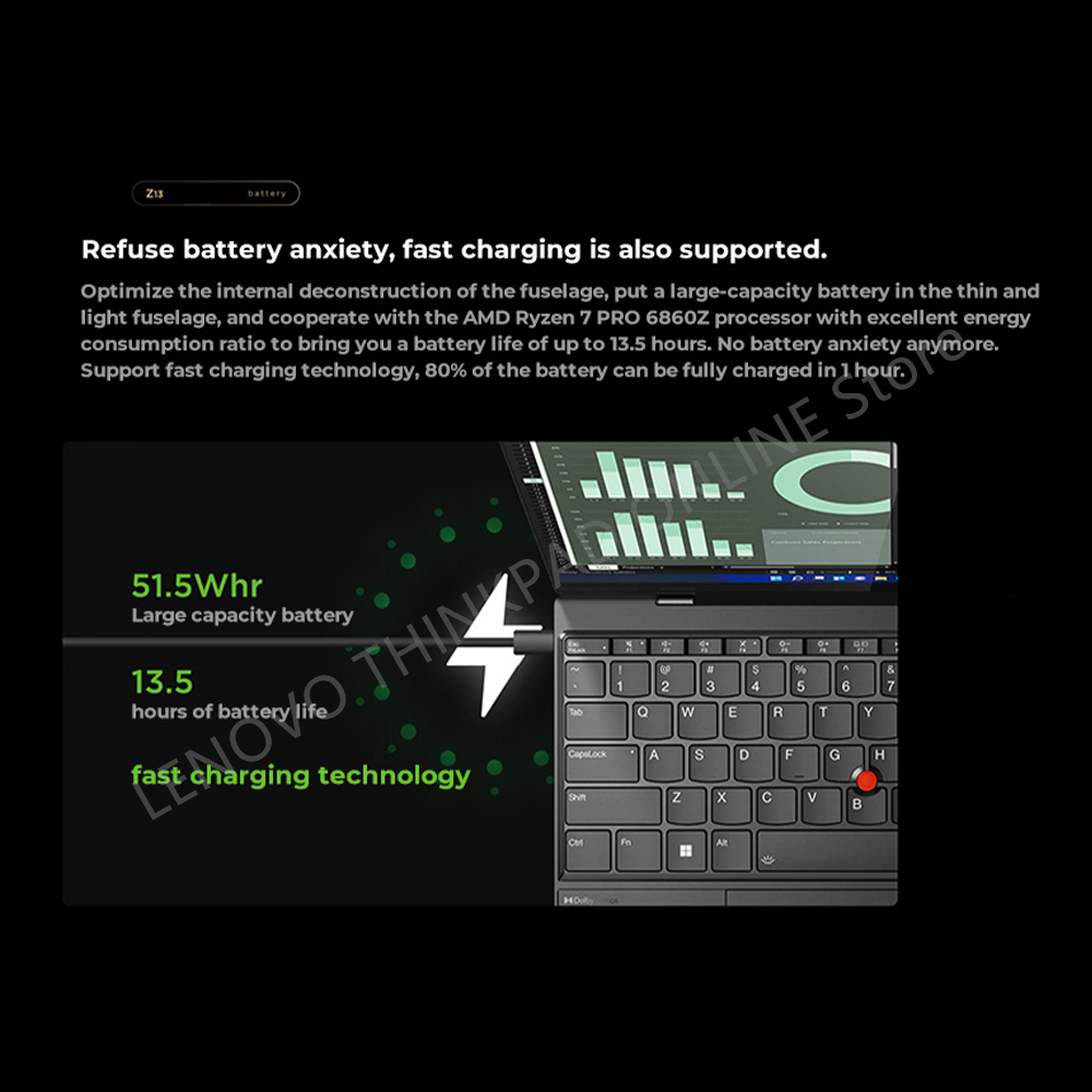 Optimize the internal deconstruction of the fuselage, put a large-capacity battery in the thin andlight fuselage, and cooperate with the AMD Ryzen 7PRO 6860Z processor with excellent energyconsumption ratio to bring you a battery life of up to 13.5 hours. No battery anxiety anymore.support fast charging technology, 80% of the battery can be fully charged in Thour.