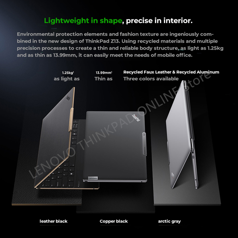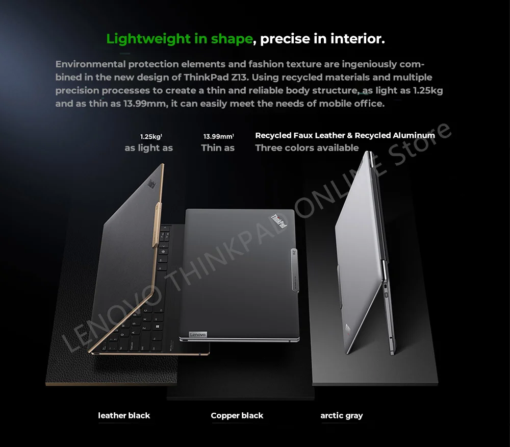 Environmental protection elements and fashion texture are ingeniously com-bined in the new design of ThinkPad Zl3. Using recycled materials and multipleprecision processes to create a thin and reliable body structure,