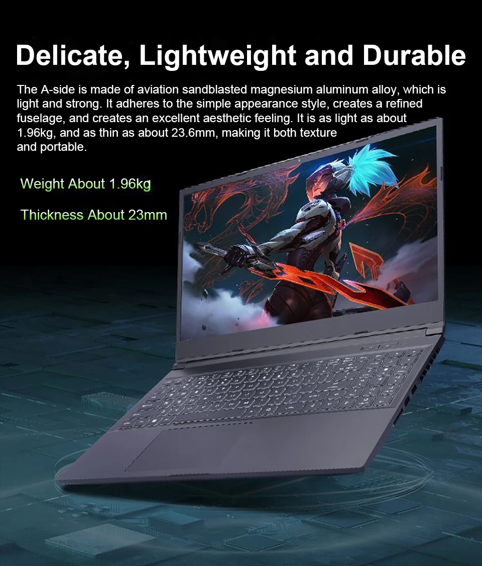 The A-side is made of aviation sandblasted magnesium aluminum alloy, which is light and strong. It adheres to the simple appearance style, creates a refined fuselage, and creates an excellent aesthetic feeling. It is as light as about 1.96kg, and as thin as about 23.6mm, making it both texture and portable.