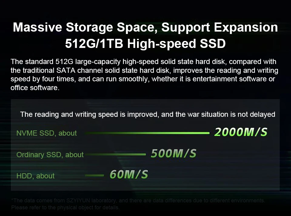The standard 512G large-capacity high-speed solid state hard disk, compared with the traditional SATA channel solid state hard disk, improves the reading and writing speed by four times, and can run smoothly, whether it is entertainment software or office software.