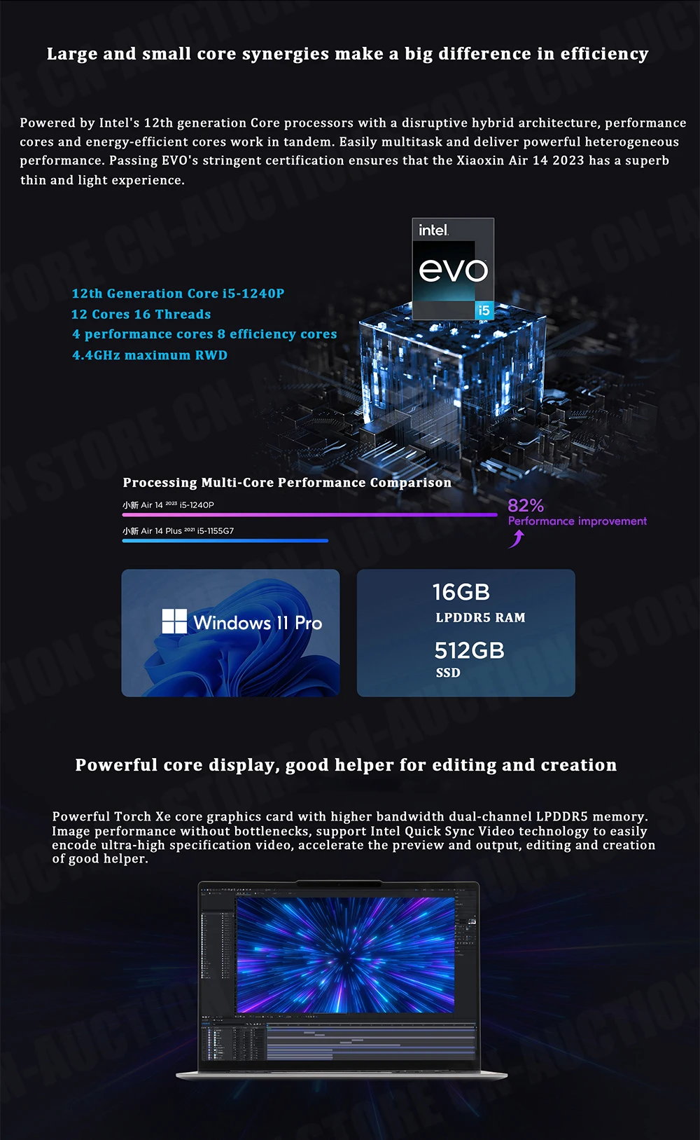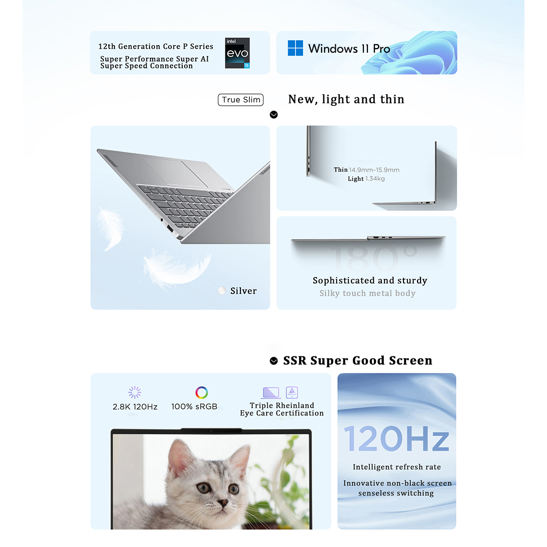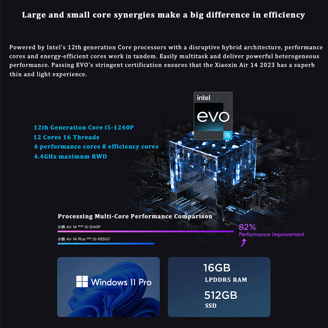 Powered by Intel's 12th generation Core processors with a disruptive hybrid architecture, performance cores and energy- efficient cores work in tandem. Easily multitask and deliver powerful heterogeneou performance. Passing EVO's stringent certification ensures that the Xiaoxin Air 14 2023 has a superb thin and light experience.