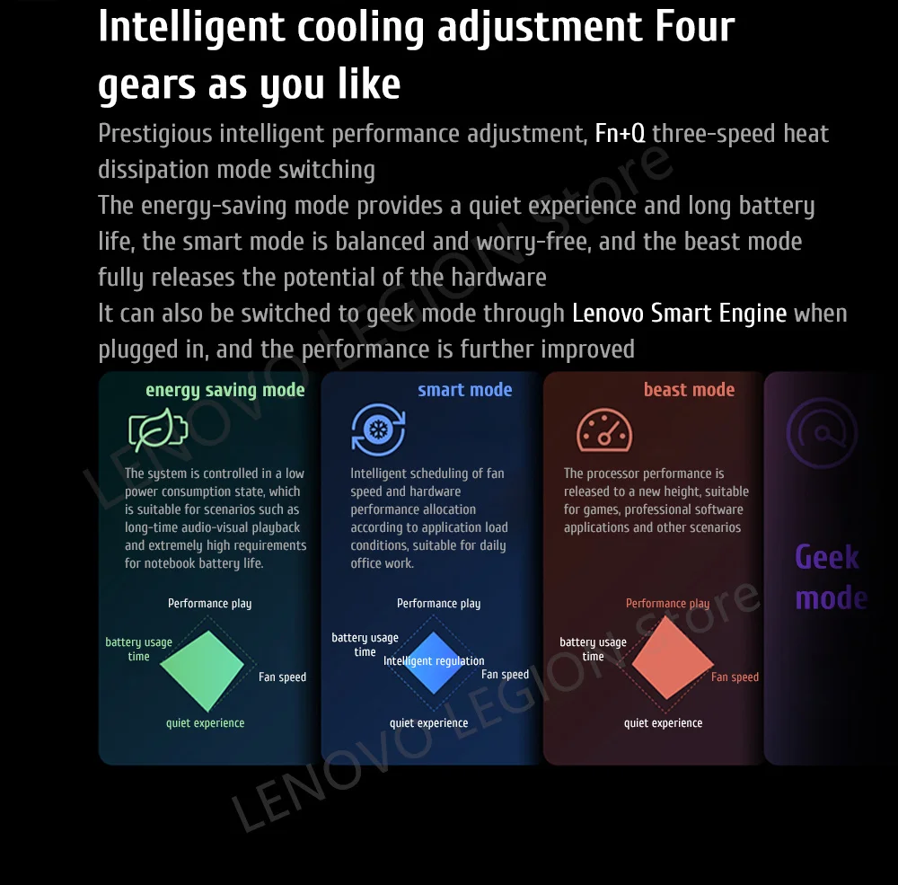 The energy-saving mode provides a quiet experience and long batterylife, the smart mode is balanced and worry-free, and the beast modefully releases the potential of the hardware.