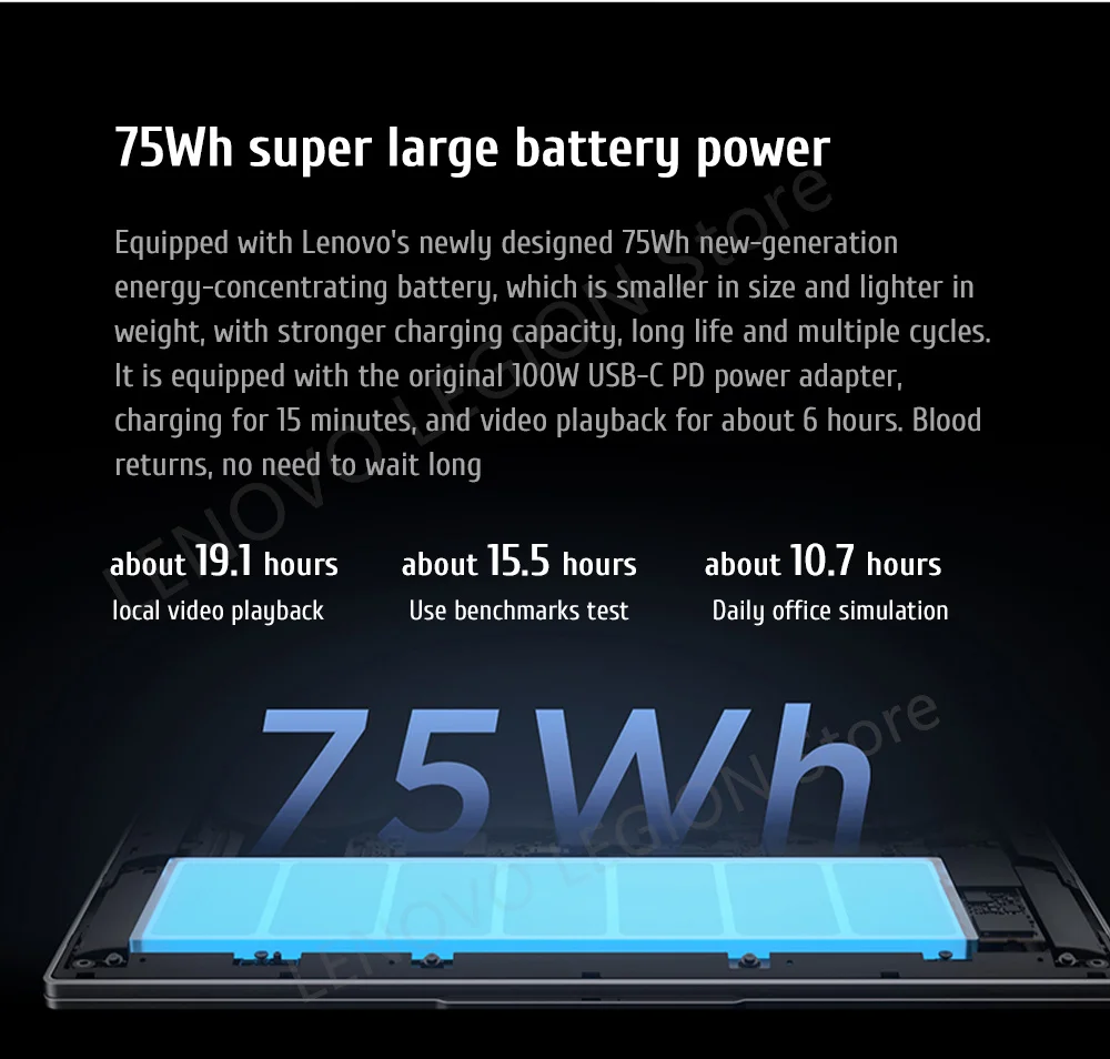 Equipped with Lenovo's newly designed 75Wh new-generation energy-concentrating battery, which is smaller in size and lighter inweight, with stronger charging capacity, long life and multiple cycles.lt is equipped with the original 100w USB-C PD power adapter, charging for 15 minutes, and video playback for about 6 hours. Blood returns, no need to wait long