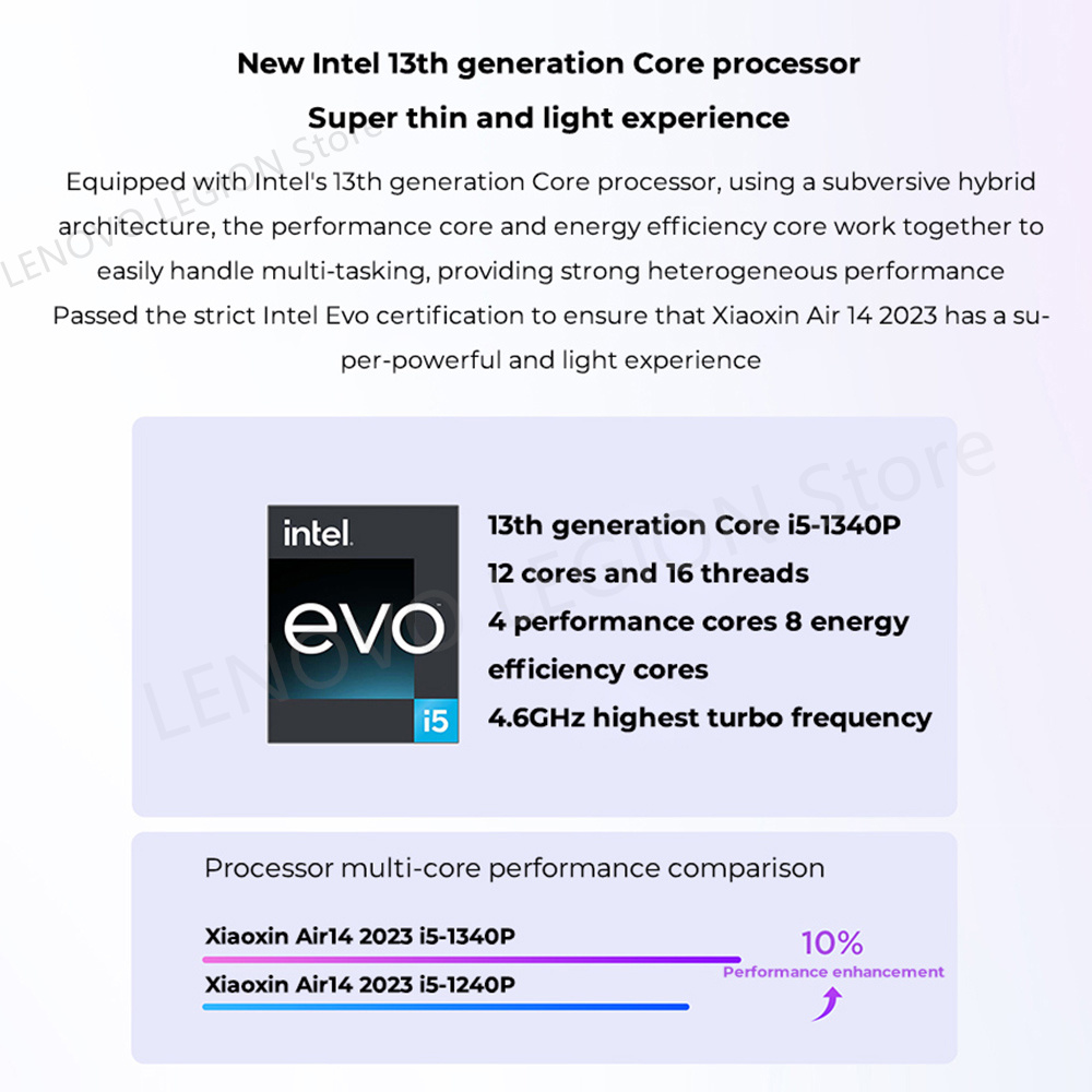 Equipped with Intel's 13th generation Core processor, using a subversive hybrid architecture, the performance core and energy efficiency core work together to easily handle multi-tasking, providing strong heterogeneous performance.Passed the strict Intel Evo certification to ensure that Xiaoxin Air 14 2023 has a super-powerful and light experience