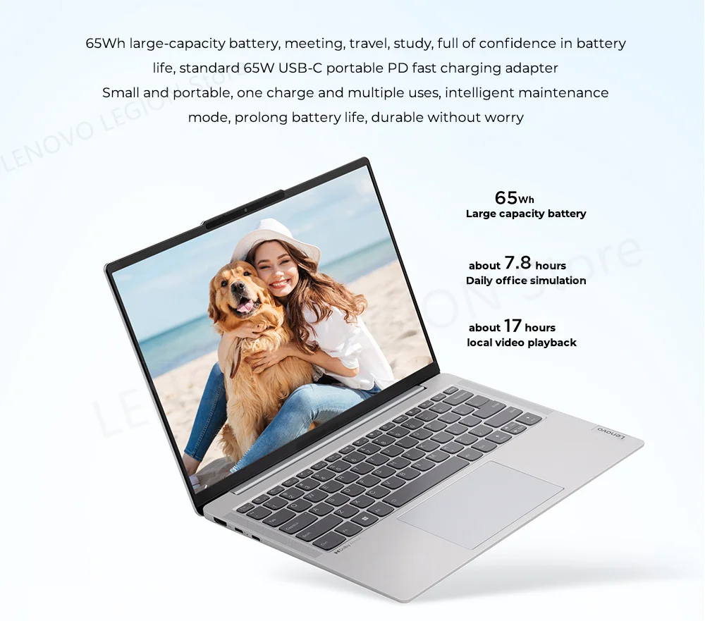 65Wh large-capacity battery, meeting, travel, study,full of confidence in battery life, standard 65w USB-C portable PD fast charging adapter. Small and portable, one charge and multiple uses, intelligent maintenance mode,