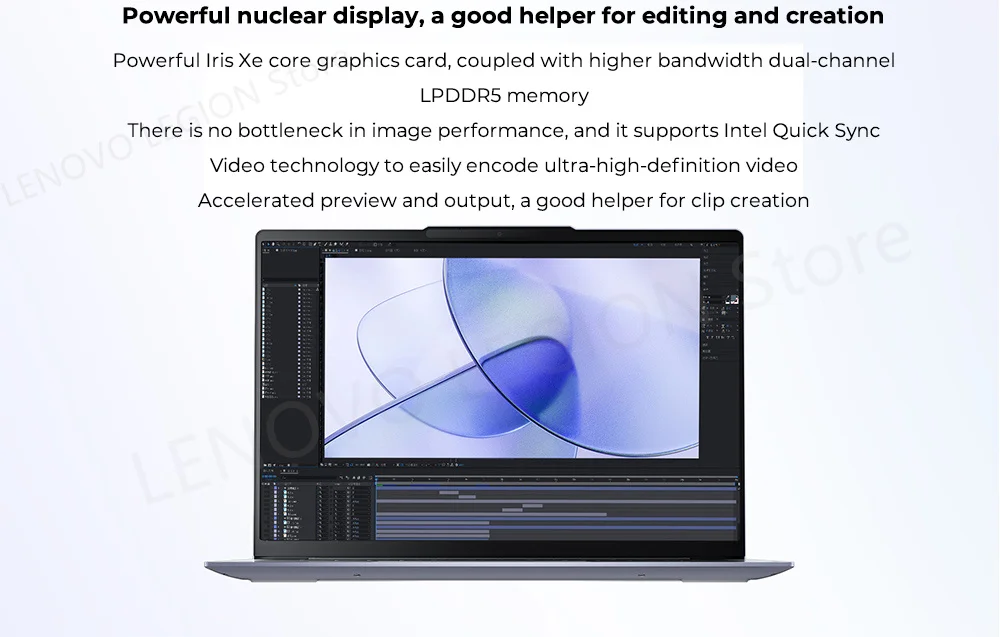 Powerful lris Xe core graphics card, coupled with higher bandwidth dual-channel LPDDR5 memory.There is no bottleneck in image performance, and it supports Intel Quick Sync Video technology to easily encode ultra-high-definition video Accelerated preview and output, a good helper for clip creation