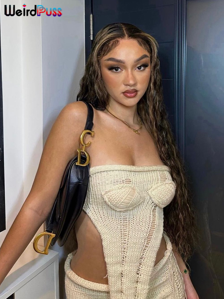 Weird Puss Crochet Sexy Women 2Piece Set Sleeveless Irregular Tube Tops+Tassel Skinny Low Neck Skirt Clubwear Matching Outfits