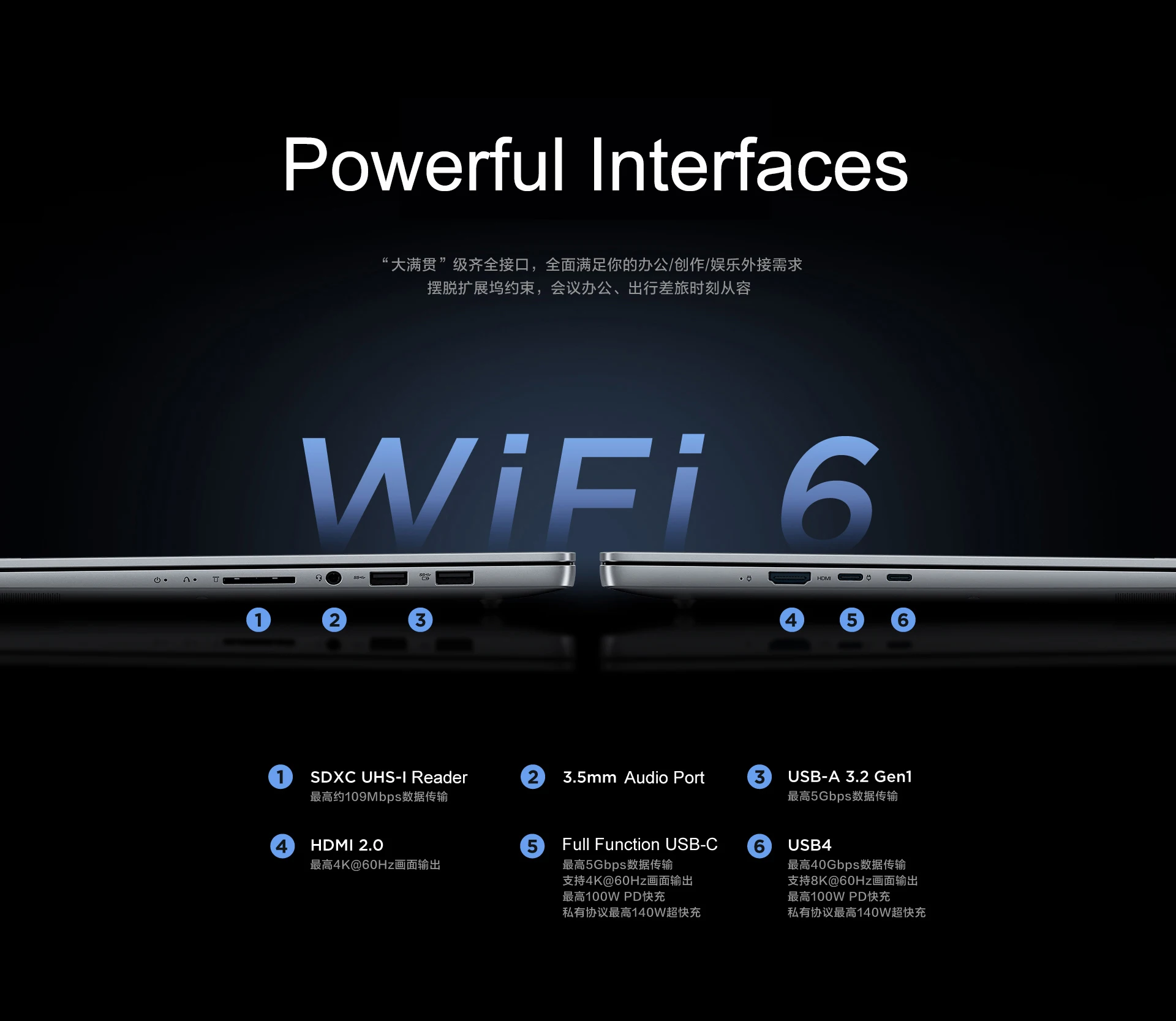 USB | 1 x Thunderbolt 4 (USB Type-C), 1 X USB Type-C, 2 x USB Type-A, HDMI 2.0, 3.5mm headphone jack, and a card reader |