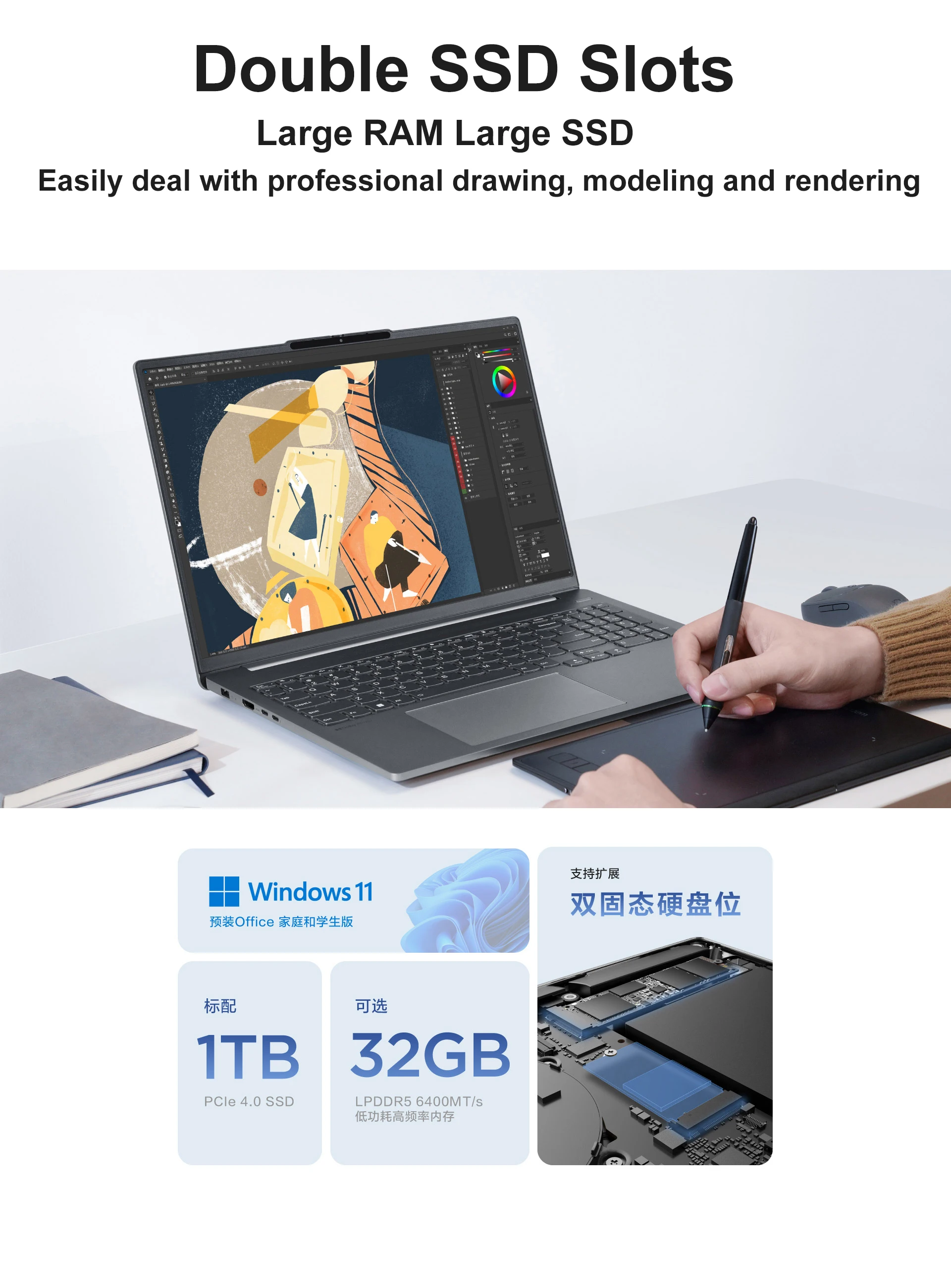 chip is paired with 16GB LPDDR5 RAM, 512GB PCIe 4.0 SSD, and dual fans for cooling.