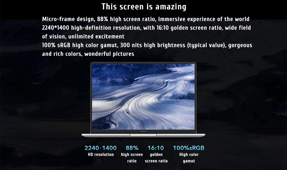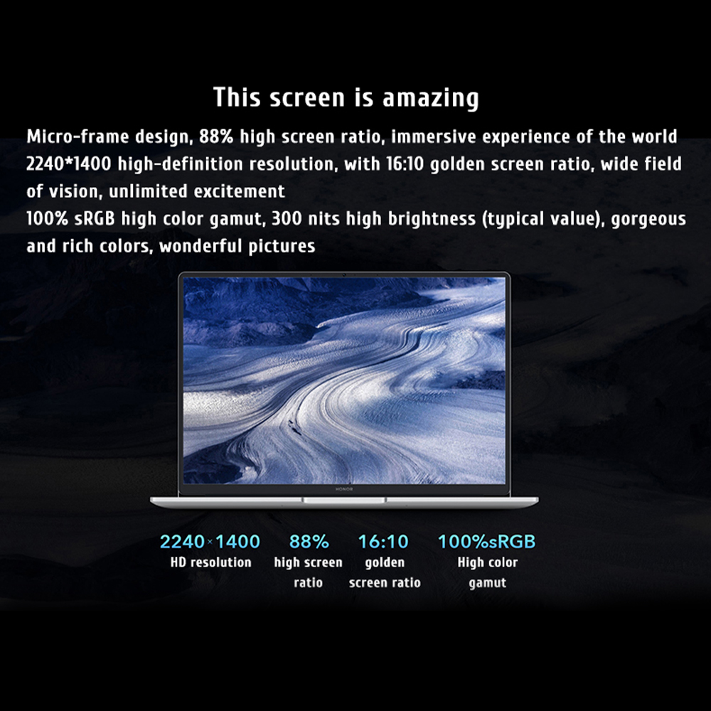 Micro-frame design, 88% high screen ratio, immersive experience of the world,2240*1400 high-definition resolution, with,16:10 golden screen ratio, wide field ,100% sRGB high color gamut, 300 nits high,brightness (typical value), gorgeous and rich colors, wonderful pictures