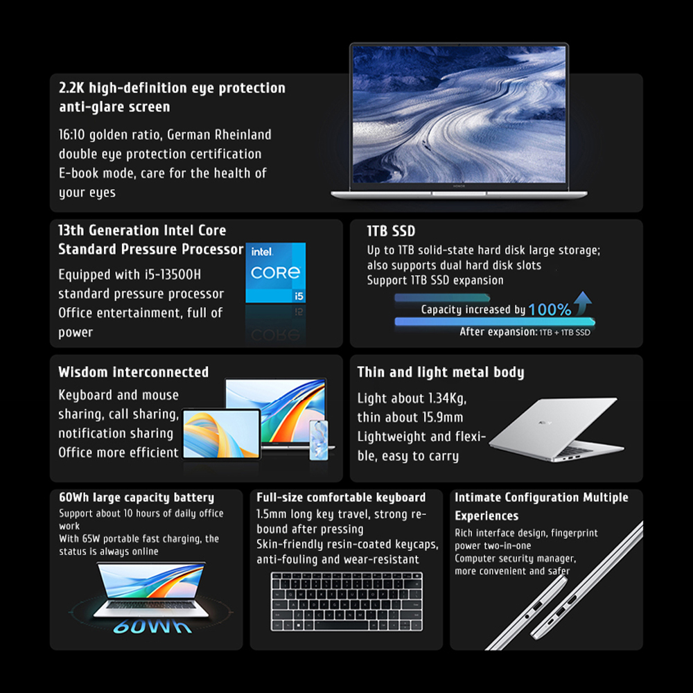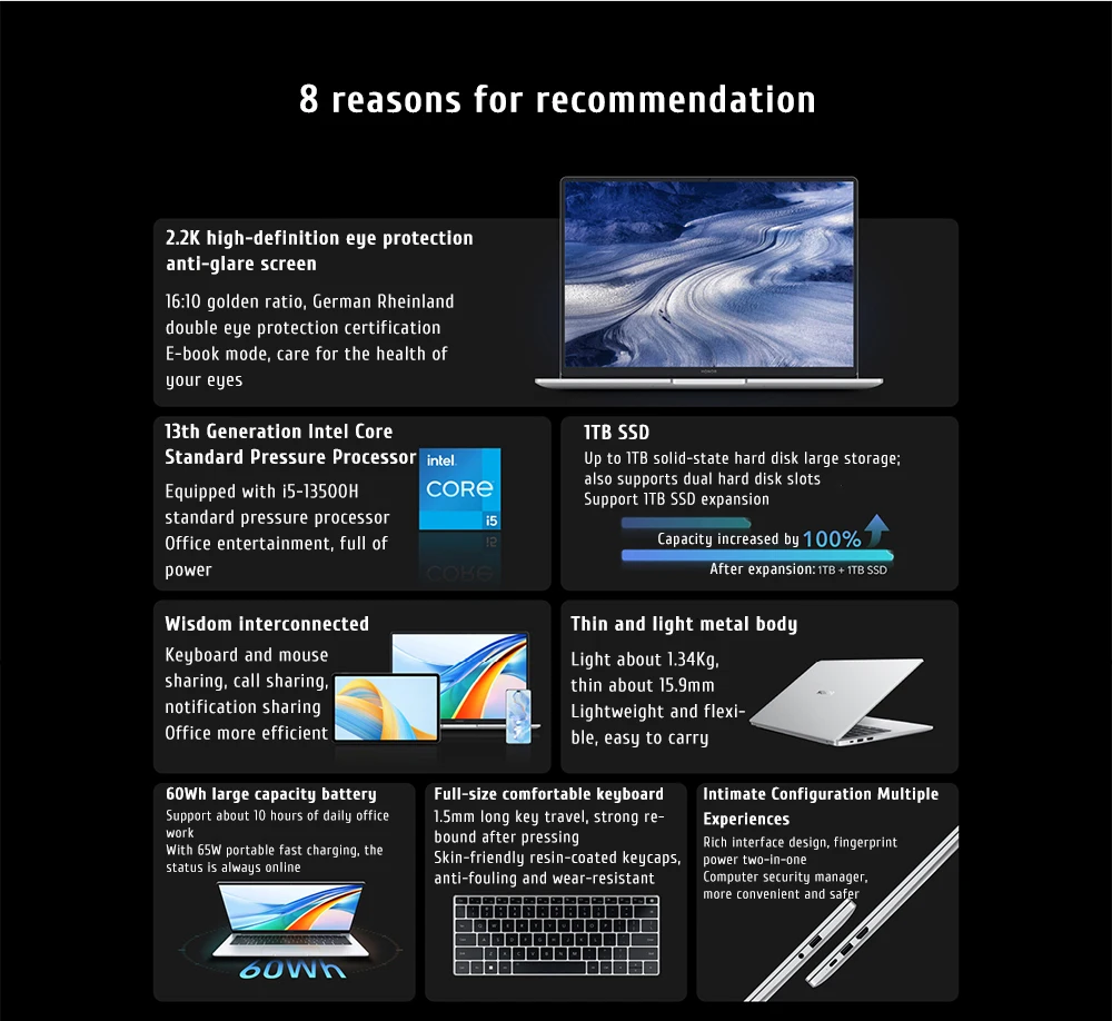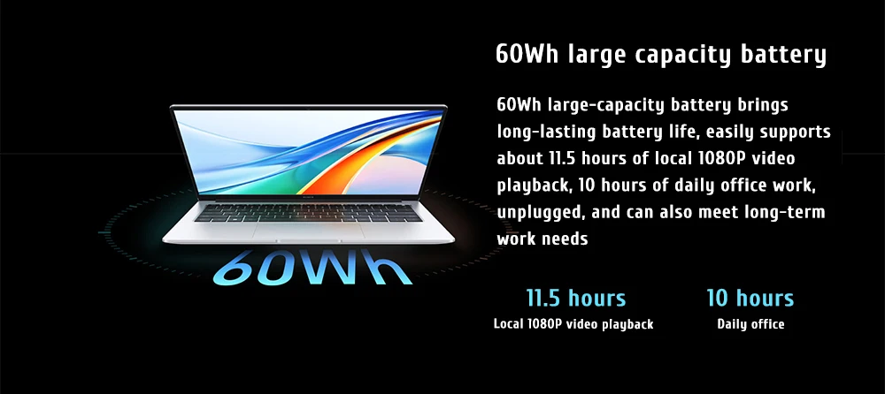 60Wh large-capacity battery brings long-lasting battery life, easily supports,about 11.5 hours of local 1080P video,playback, 10 hours of daily office work,unplugged, and can also meet long-term,work needs