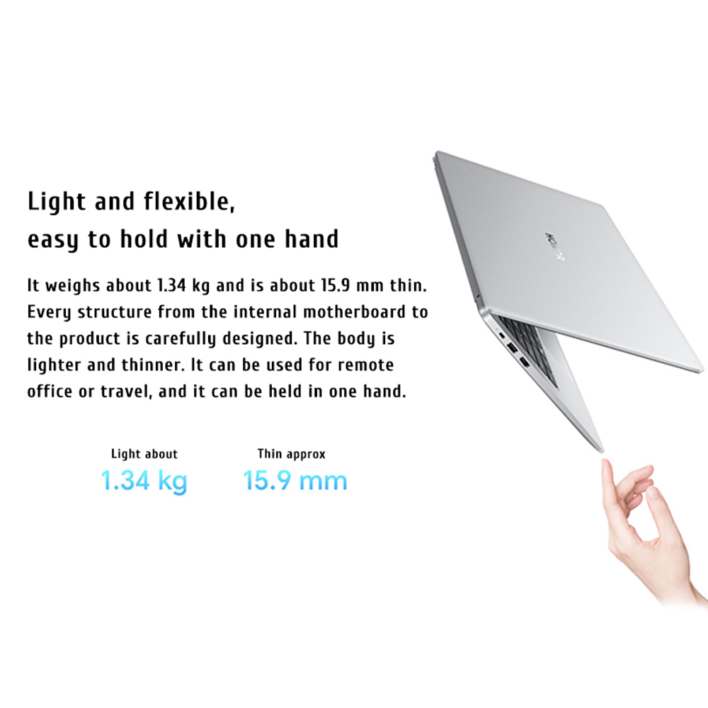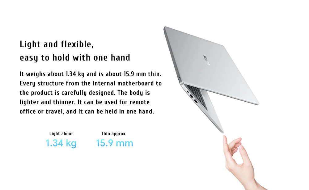 It weighs about 1.34 kg and is about 15.9 mm thin,Every structure from the internal motherboard to,the product is carefully designed. The body is lighter and thinner. It can be used for remote,office or travel, and it can be held in one hand