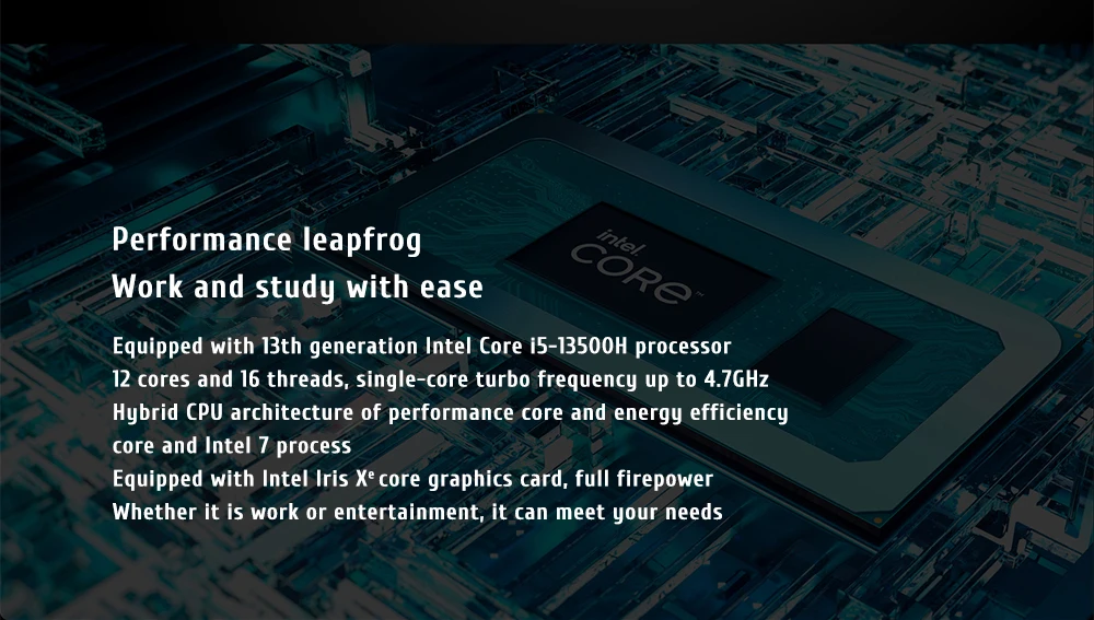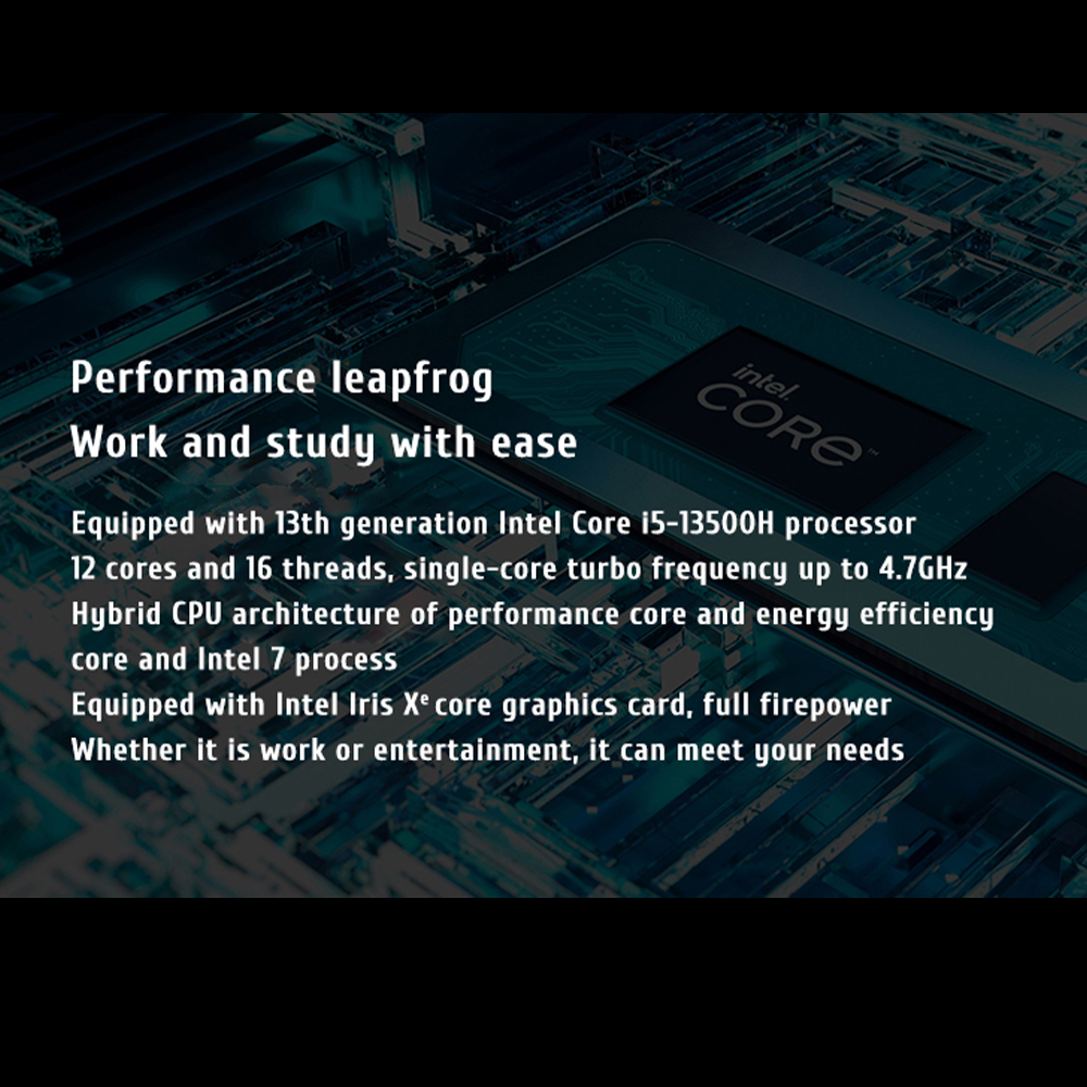 Equipped with 13th generation Intel Core i5-13500H processor,12 cores and 16 threads, single-core turbo frequency up to 4.7GHz,Hybrid CPU architecture of performance core and energy efficiency CPU,core and Intel 7 process,Equipped with Intel lris Xe core graphics card, full firepower,Whether it is work or entertainment, it can meet your needs