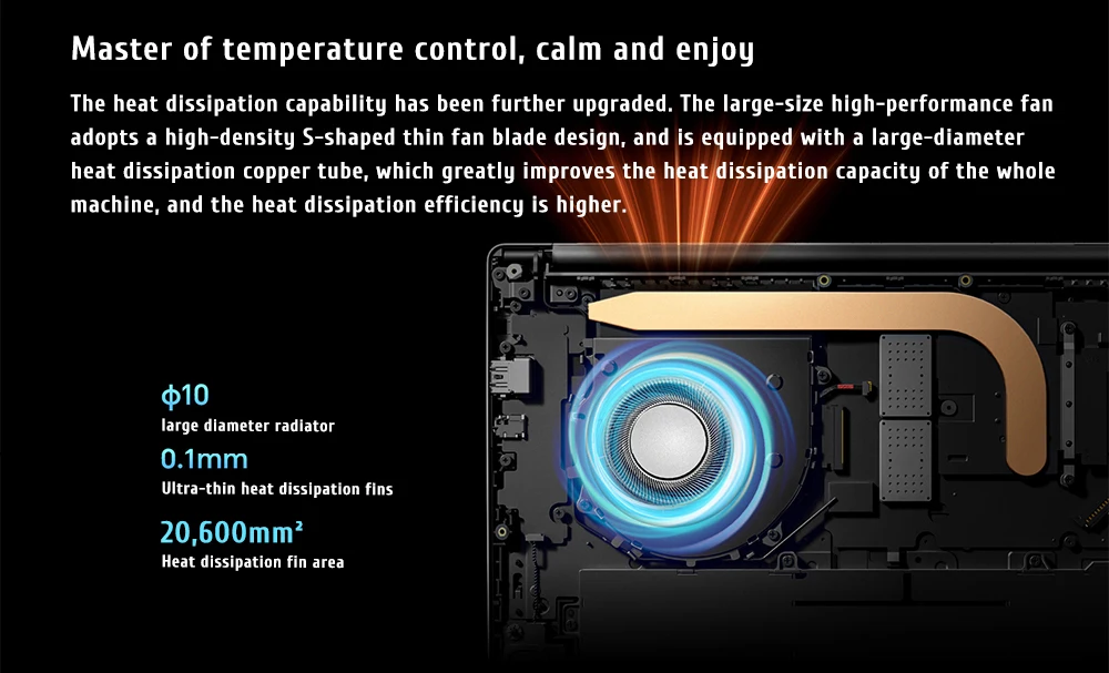 The heat dissipation capability has been further upgraded. The large-size high-performance fan,adopts a high-density S-shaped thin fan blade design, and is equipped with a large-diameter,heat dissipation copper tube, which greatly improves the heatdissipation capacity of the whole,machine, and the heat dissipation efficiency is higher.