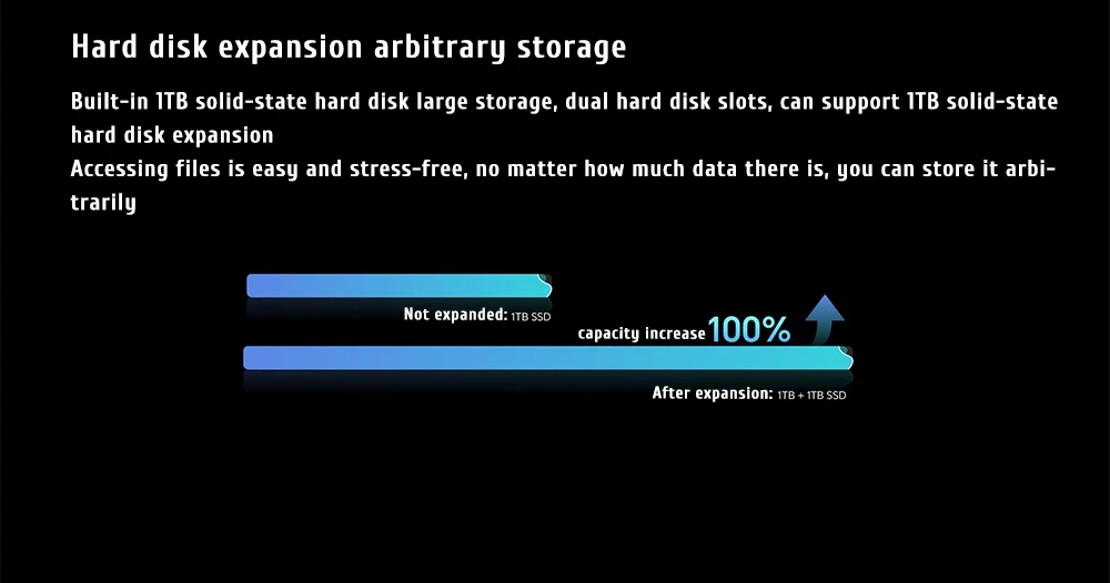 Built-in 1TB solid-state hard disk large storage, dual hard disk slots, can support 1TB solid-state
