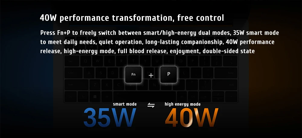 Press Fn+P to freely switch between smart/high-energy dual modes, 35W smart mode,to meet daily needs, quiet operation, long-lasting companionship, 40W performance,release, high-energy mode, full blood release, enjoyment, double-sided state
