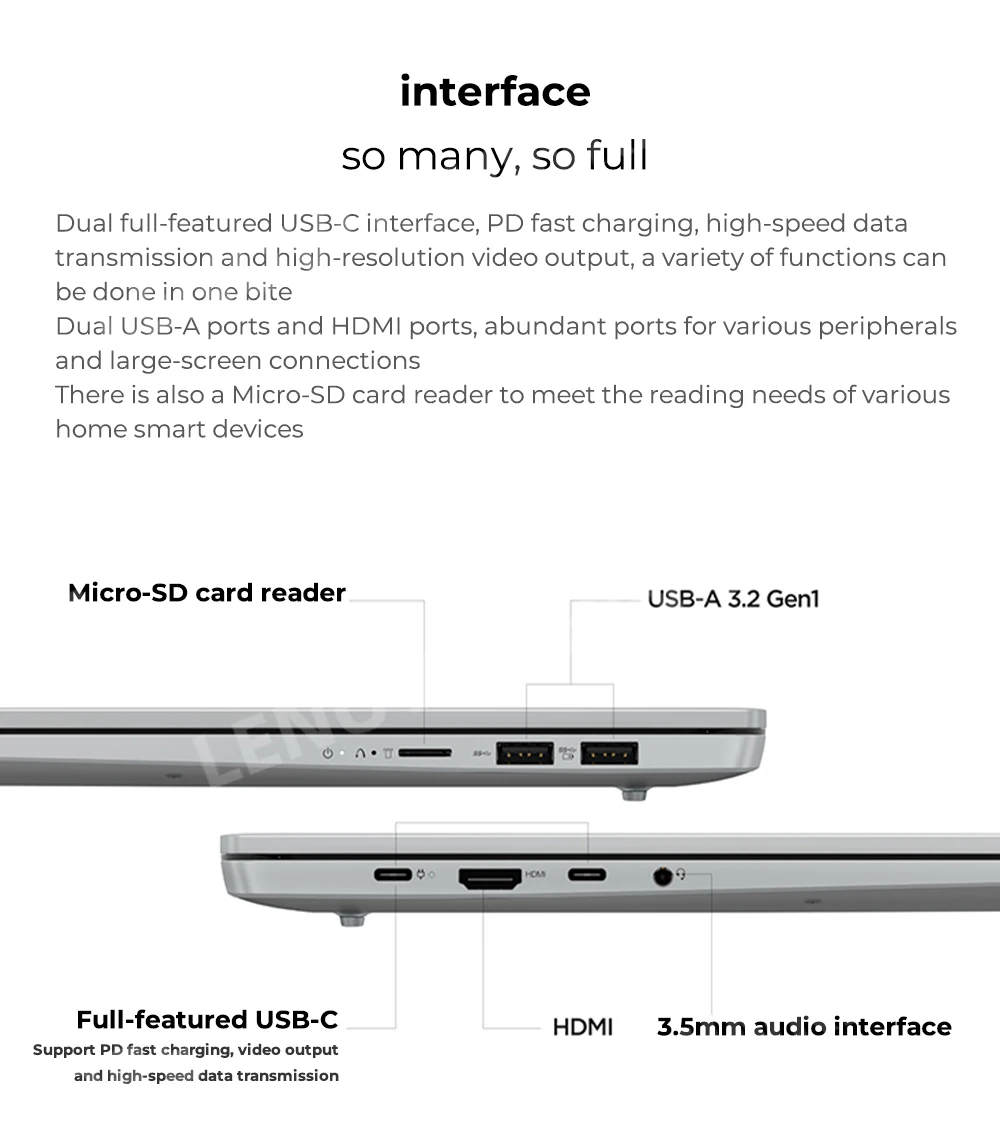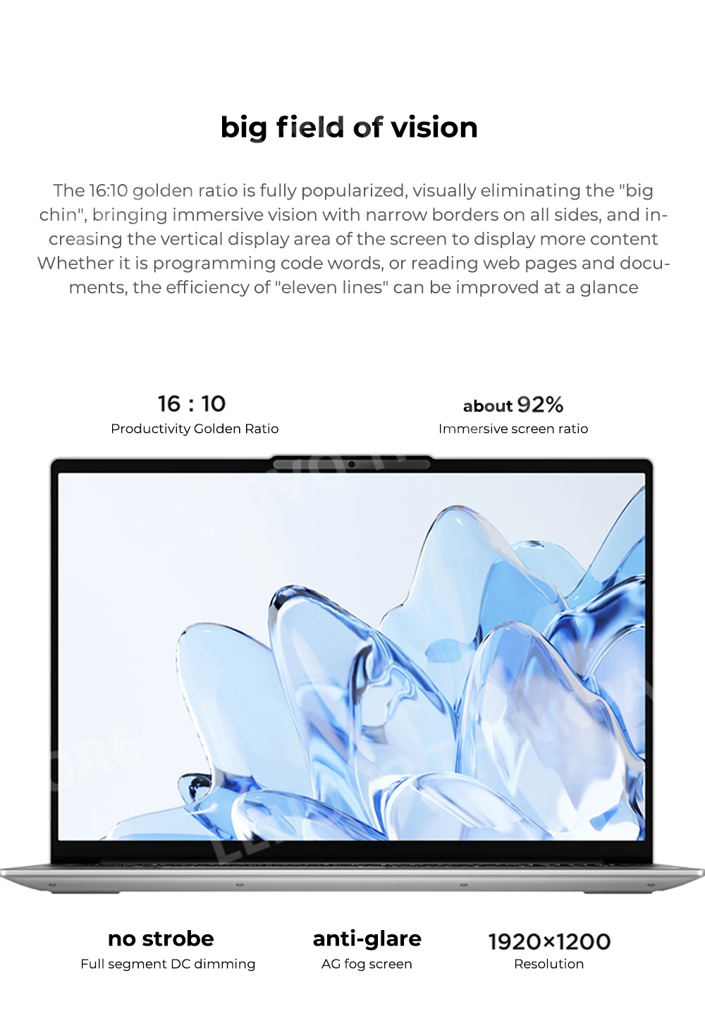 The 1610 golden ratio is fully popularized, visually eliminating the "big chin", bringing immersive vision with narrow borders on al sides, and in- creasing the vertical display area of the screen to display more content.Whether it is programming code words, or reading web pages and docu-ments, the efficiency of "eleven lines" can be improved at a glance