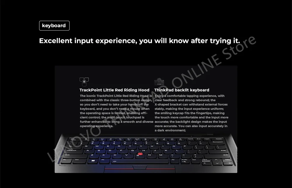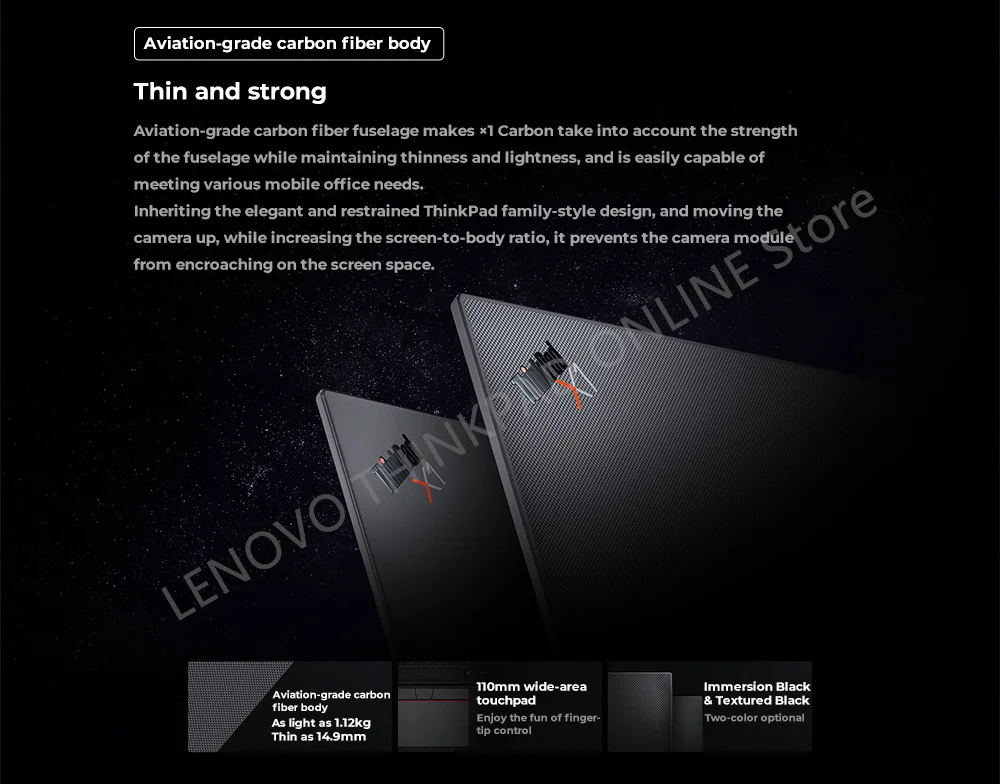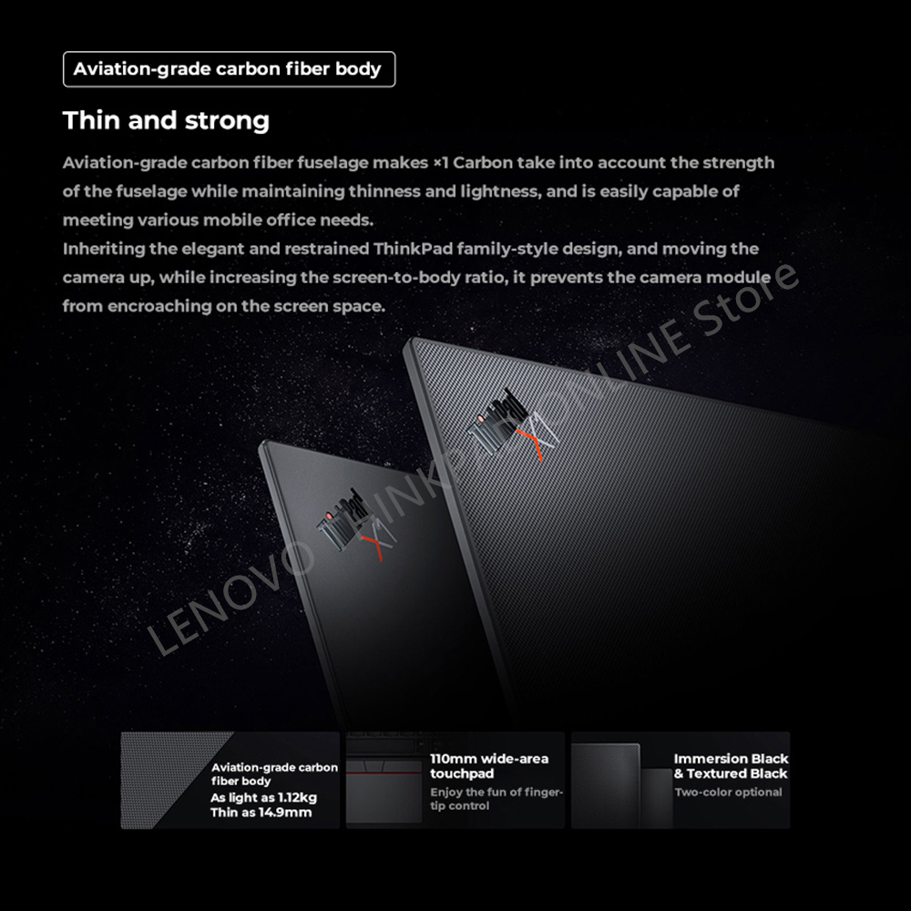 Aviation-grade carbon fiber fuselage makes *1 Carbon take into account the strengthof the fuselage while maintaining thinness and lightness, and is easily capable ofmeeting various mobile office needs.Inheriting the elegant and restrained ThinkPad family-style design, and moving thecamera up, while increasing the screen-to-body ratio, it prevents the camera modulefrom encroaching on the screen space.