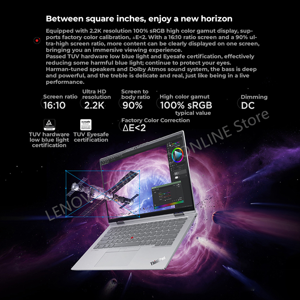 Equipped with 2.2K resolution 100% sRGB high color gamut display, sup-ports factory color calibration, E<2.With a 16:10 ratio screen and a 90% ul-tra-high screen ratio, more content can be clearly displayed on one screen,bringing you an immersive viewing experience.