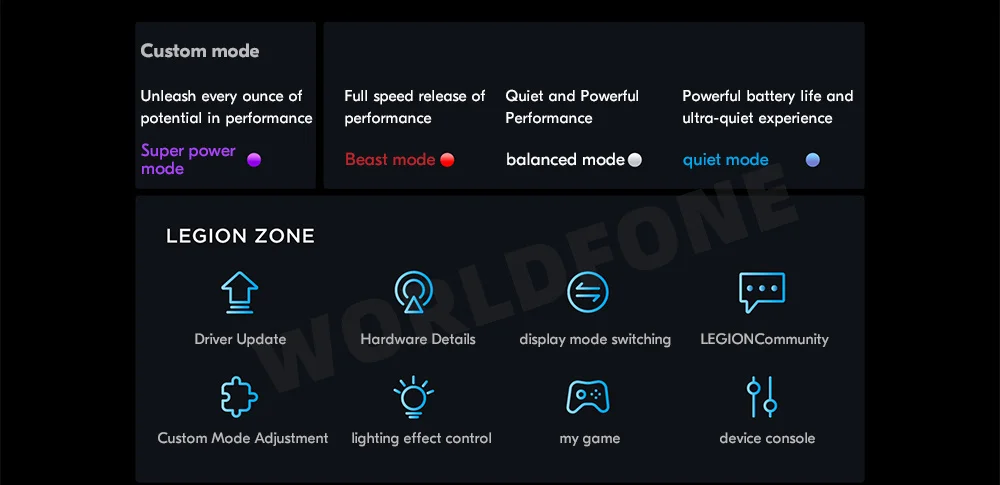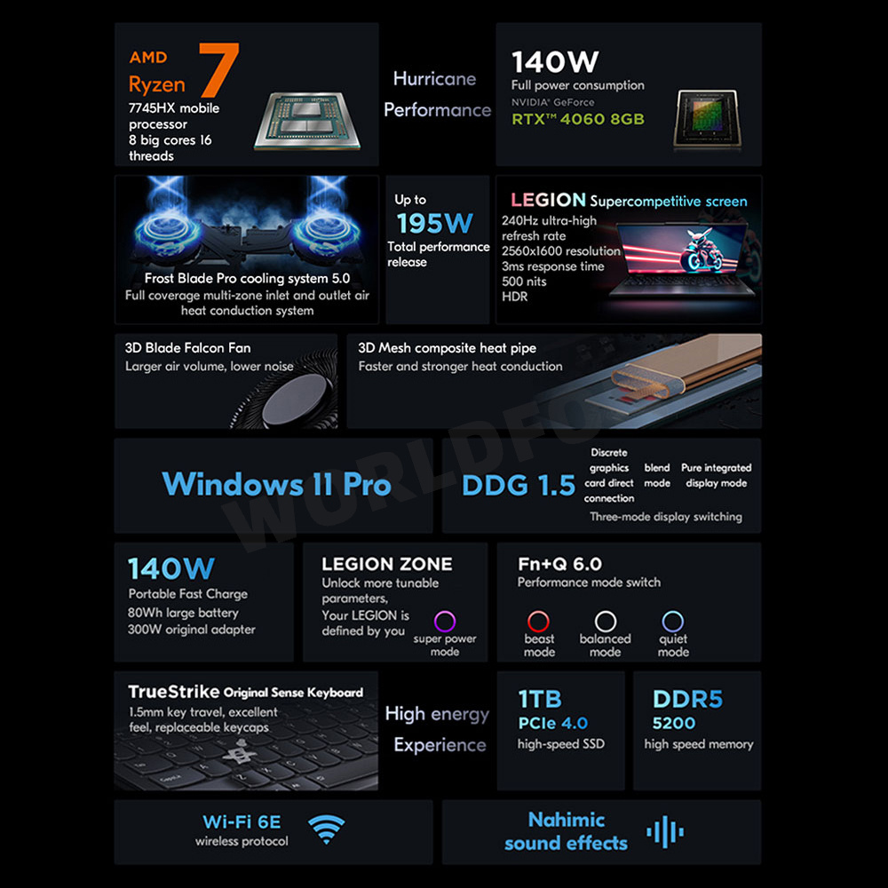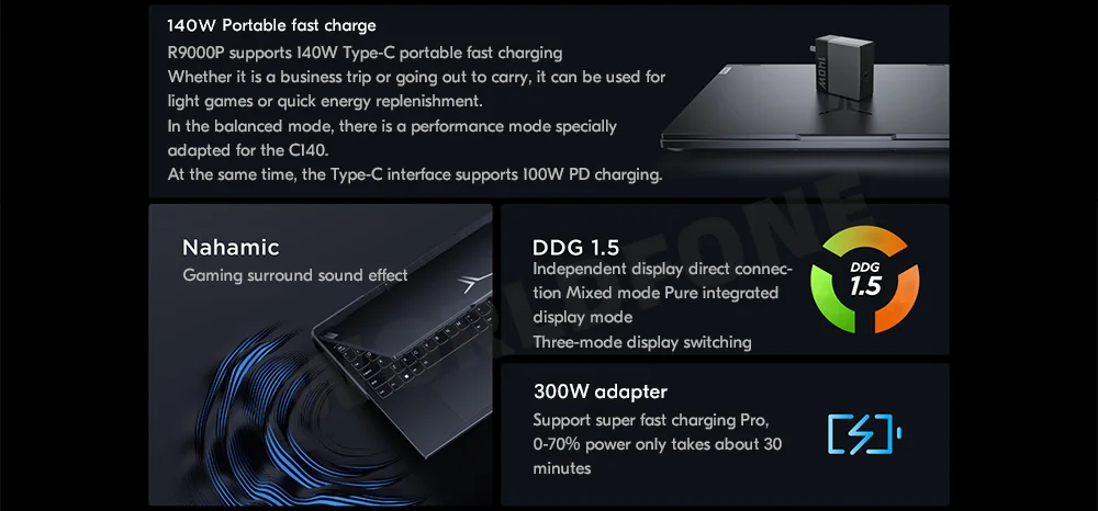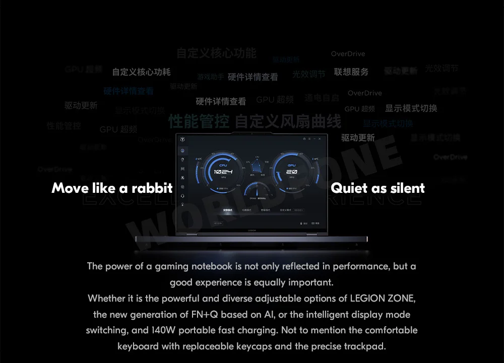 Whether it is the powerful and diverse adjustable options of LEGION ZONE,the new generation of FN+Q based on Al, or the intelligent display modeswitching, and 14oW portable fast charging.