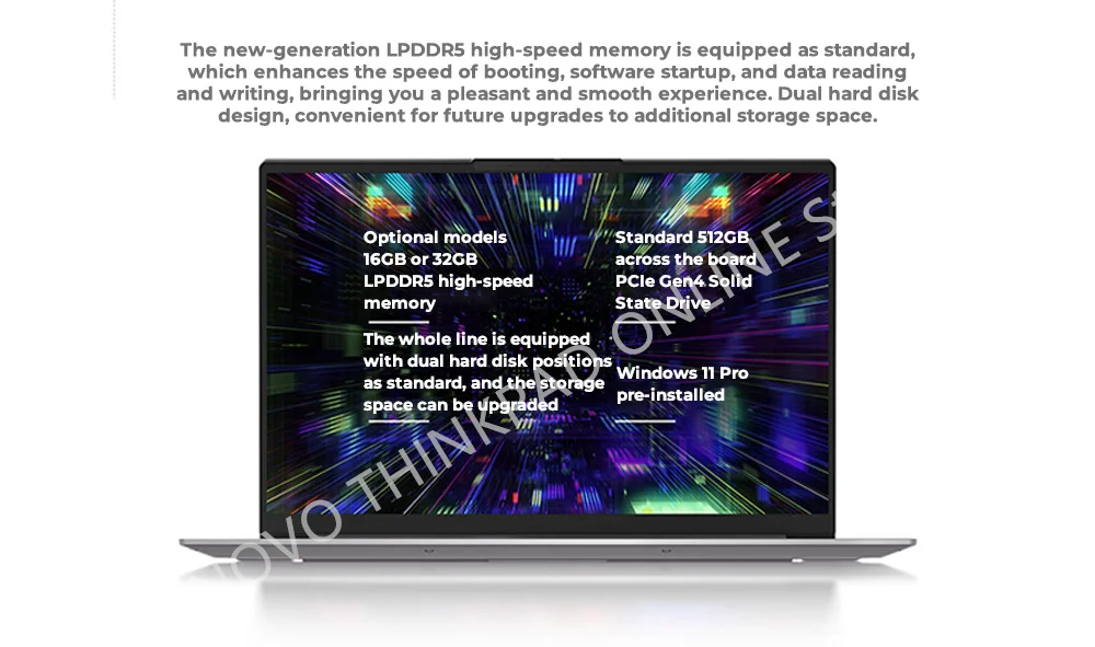 The new-generation LPDDR5 high-speed memory is equipped as standard,which enhances the speed of booting, software startup, and data readingand writing, bringing you a pleasant and smooth experience. Dual hard disk design, convenient for future upgrades to additional storage space.