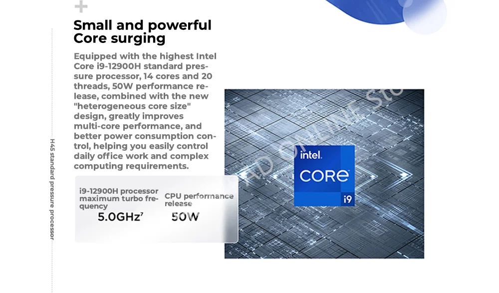 Equipped with the highest IntelCore i9-12900H standard pres-sure processor, 14 cores and 20threads, 50W performance re-lease, combined with the new"heterogeneous core size"