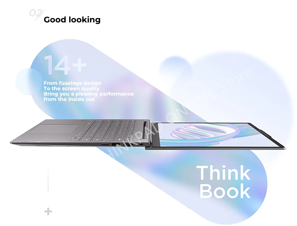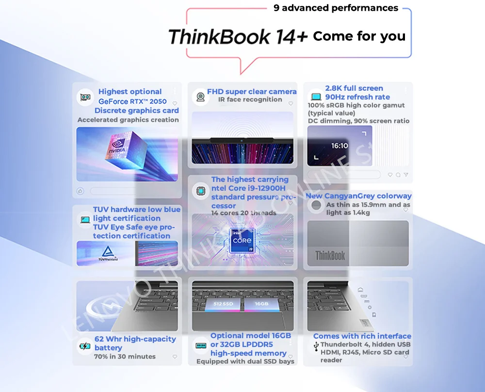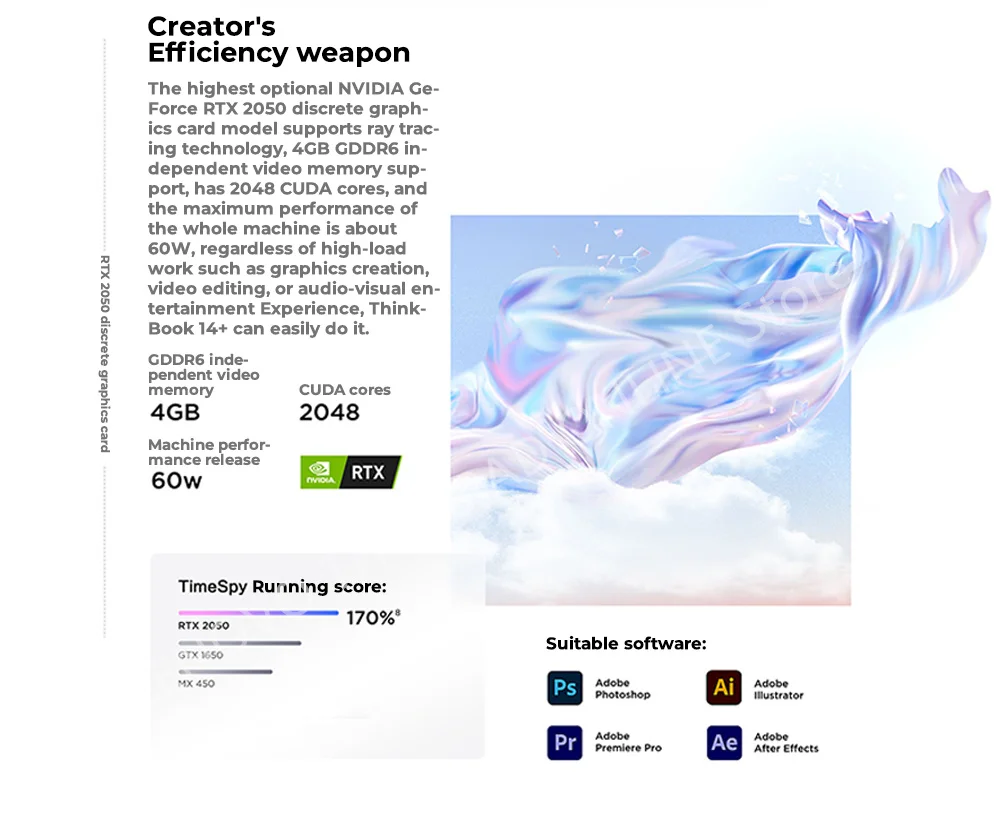 The highest optional NVIDIA Ge-Force RTX 2050 discrete graph-ics card model supports ray trac-ing technology, 4GB GDDR6 in-dependent video memory sup-port, has 2048 CUDA cores, andthe maximum performance ofthe whole machine is about6ow, regardless of high-loadwork such as graphics creation,video editing, or audio-visual en-tertainment Experience,Think-Book 14+ can easily do it.