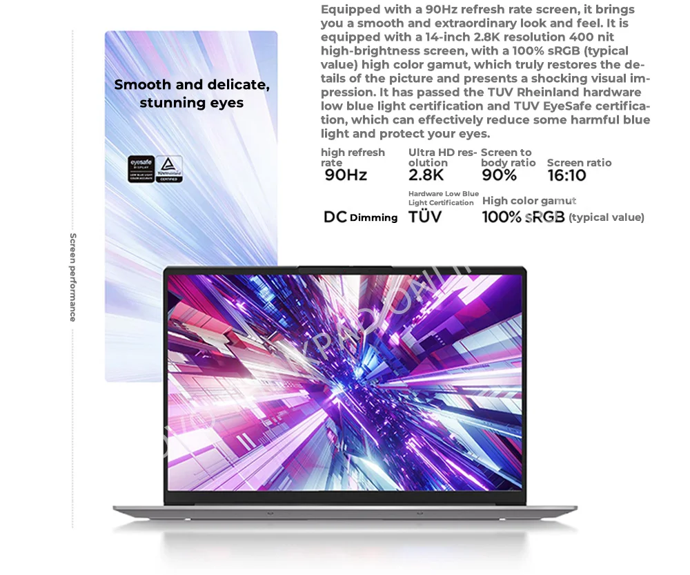 Equipped with a 90Hz refresh rate screen, it bringsyou a smooth and extraordinary look and feel.It isequipped with a 14-inch 2.8K resolution 400 nithigh-brightness screen, with a 100% sRGB (typicalvalue) high color gamut, which truly restores the de-tails of the picture and presents a shocking visual im-pression.It has passed the TUV Rheinland hardwarelow blue light certification and TUV EyeSafe certifica-tion, which can effectively reduce some harmful bluelight and protect your eyes.