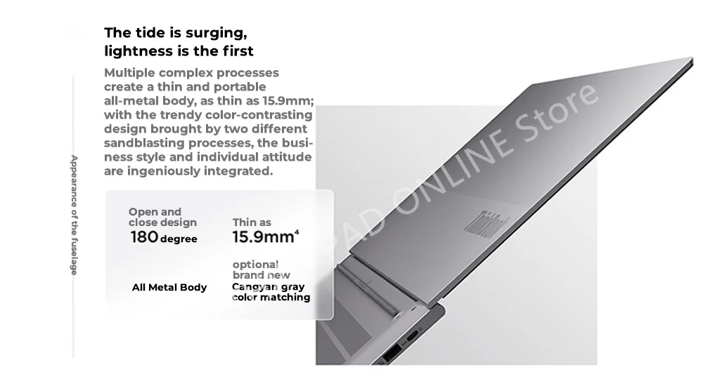 Multiple complex processescreate a thin and portable all-metal body , as thin as 15.9mm;with the trendy color-contrastingdesign brought by two differentsandblasting processes,