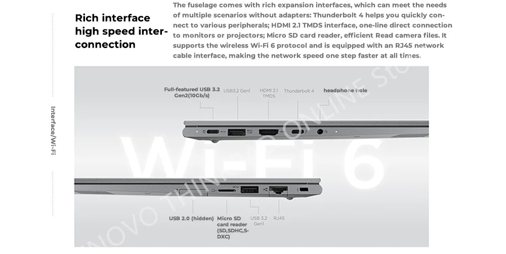 The fuselage comes with rich expansion interfaces, which can meet the needsof multiple scenarios without adapters: Thunderbolt 4 helps you quickly con-nect to various peripherals;HDMI2.1TMDS interface,